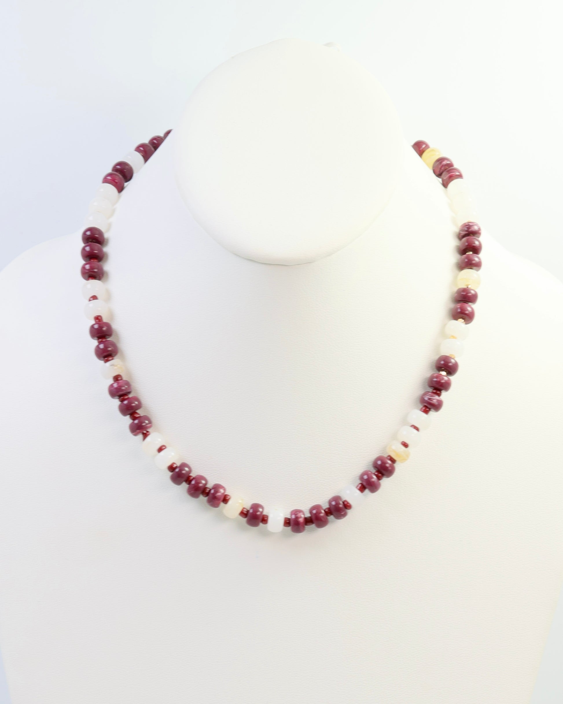 Elevate your game day look with the Ellison Stone Necklace in maroon and white. This stylish piece shines on its own or layered with other necklaces, making it a versatile accessory to showcase your team spirit with flair. Perfect for adding a fashionable touch to any outfit while celebrating your favorite colors.