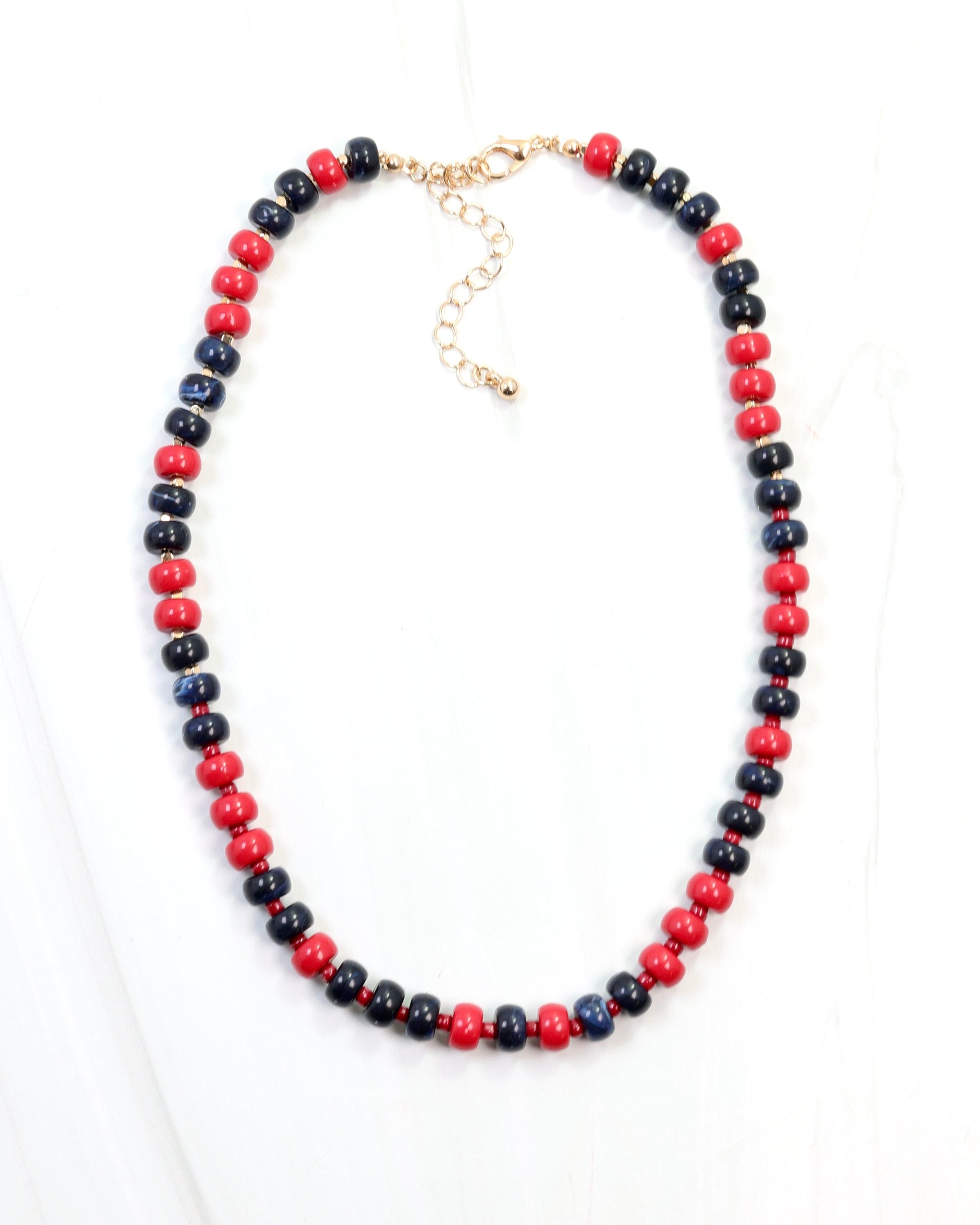Elevate your game day look with the Ellison Stone Necklace in red and navy. This stylish piece shines on its own or layered with other necklaces, making it a versatile accessory to showcase your team spirit with flair. Perfect for adding a fashionable touch to any outfit while celebrating your favorite colors.