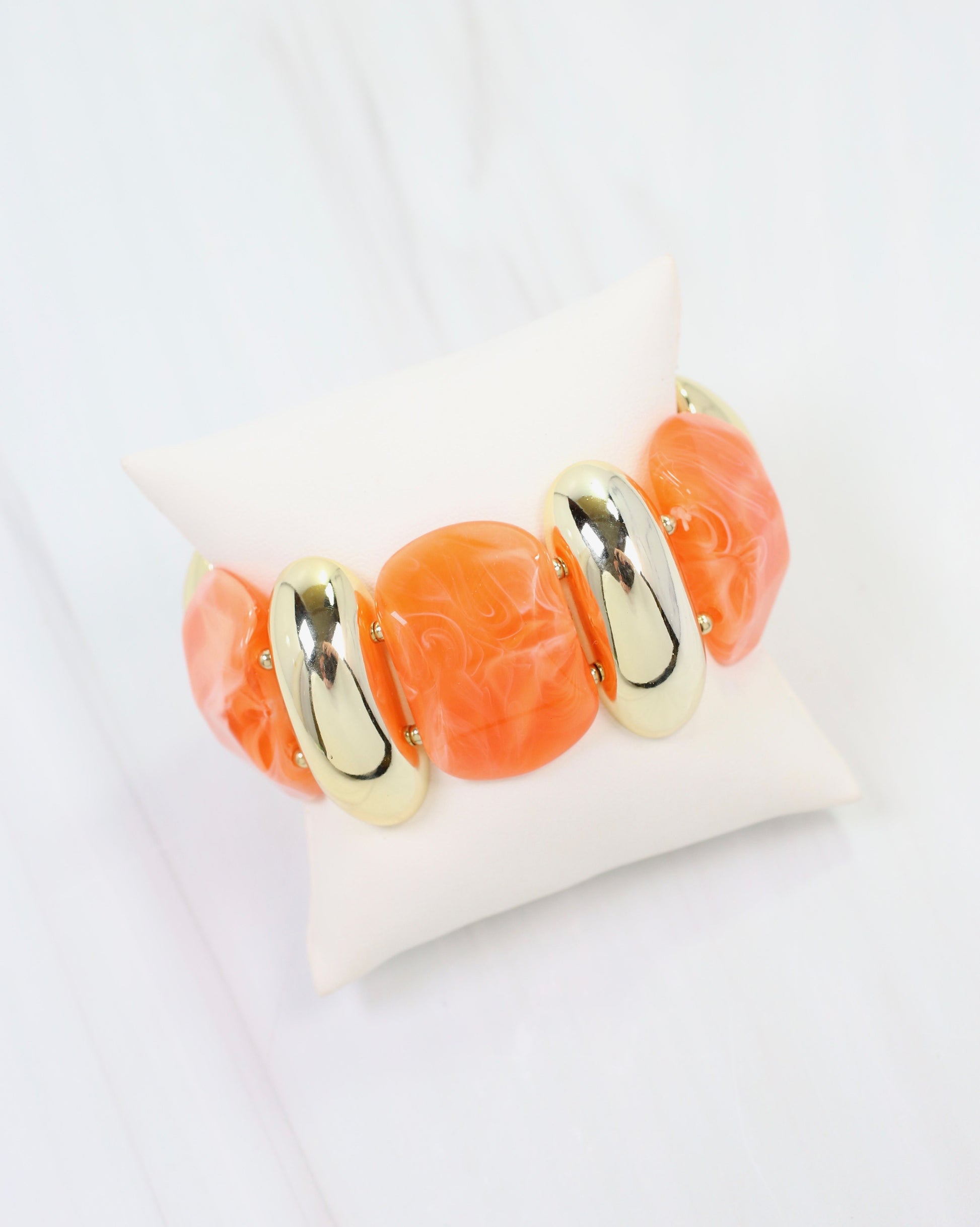 The Emporia Stretch Bracelet Orange features a refined blend of orange-patterned and gold beads, strung on a flexible stretch band for an elegant yet comfortable fit. Its timeless design adds a subtle touch of sophistication to any outfit.