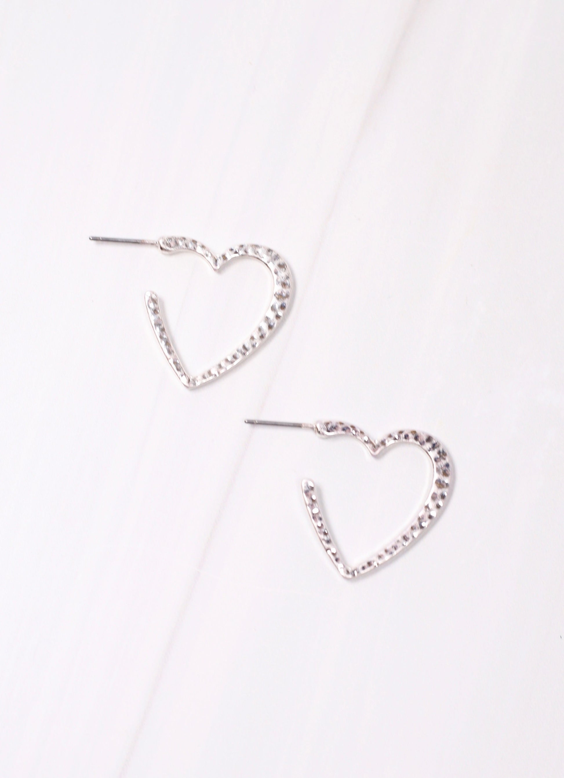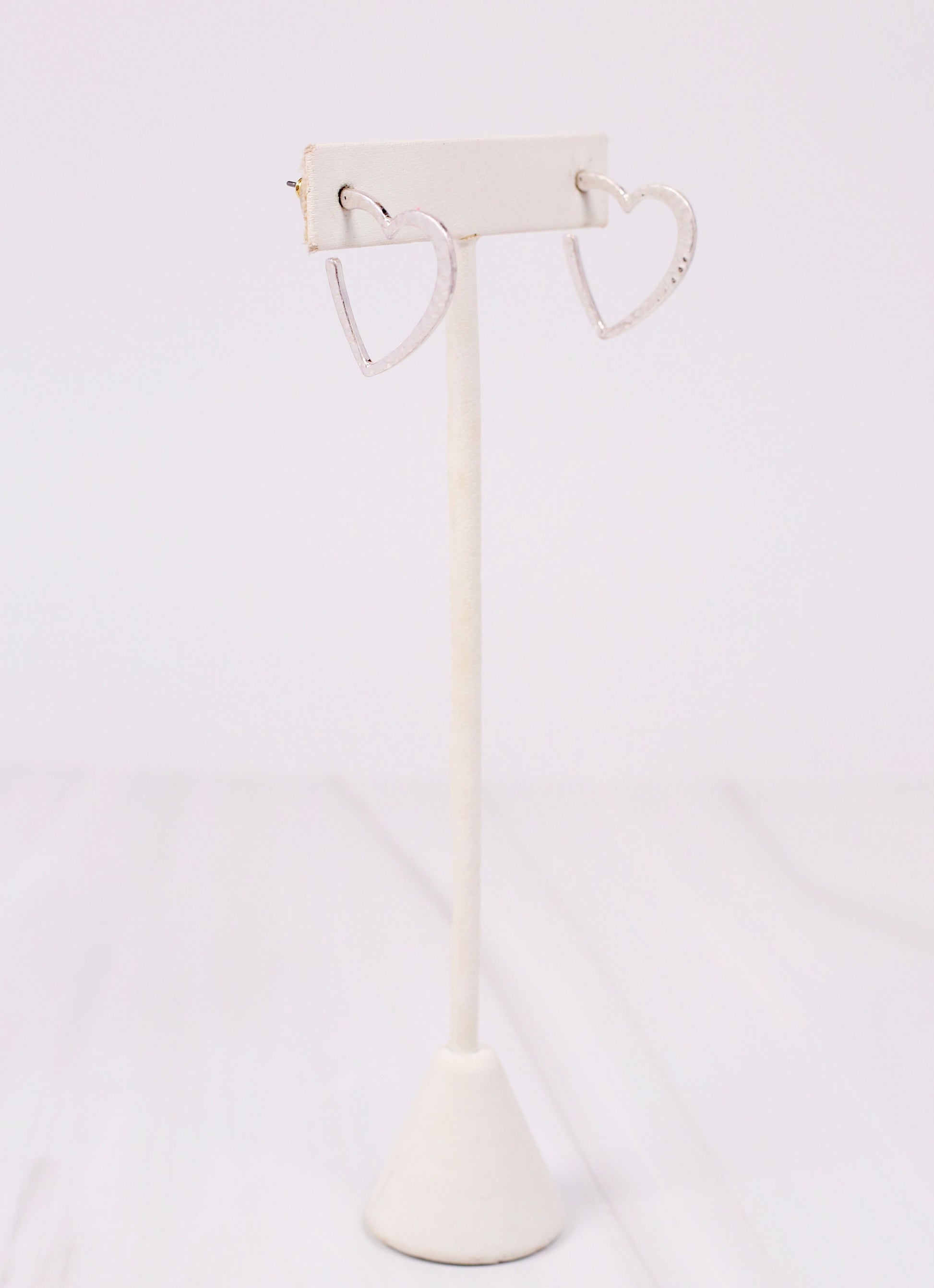 This basic little heart hoop earring has a worn textured finish on a post back.