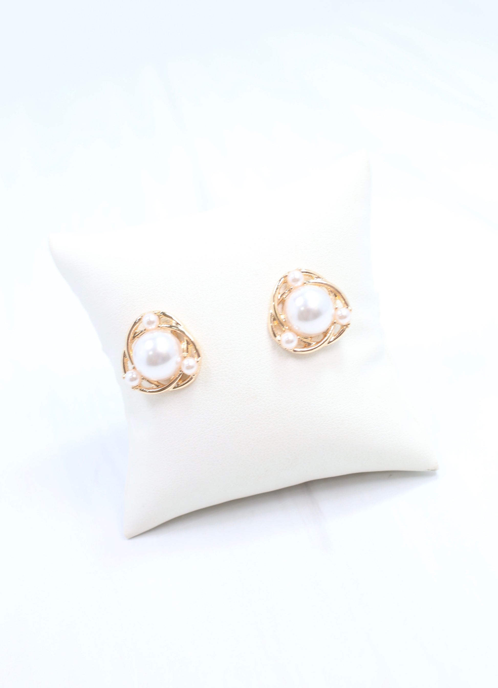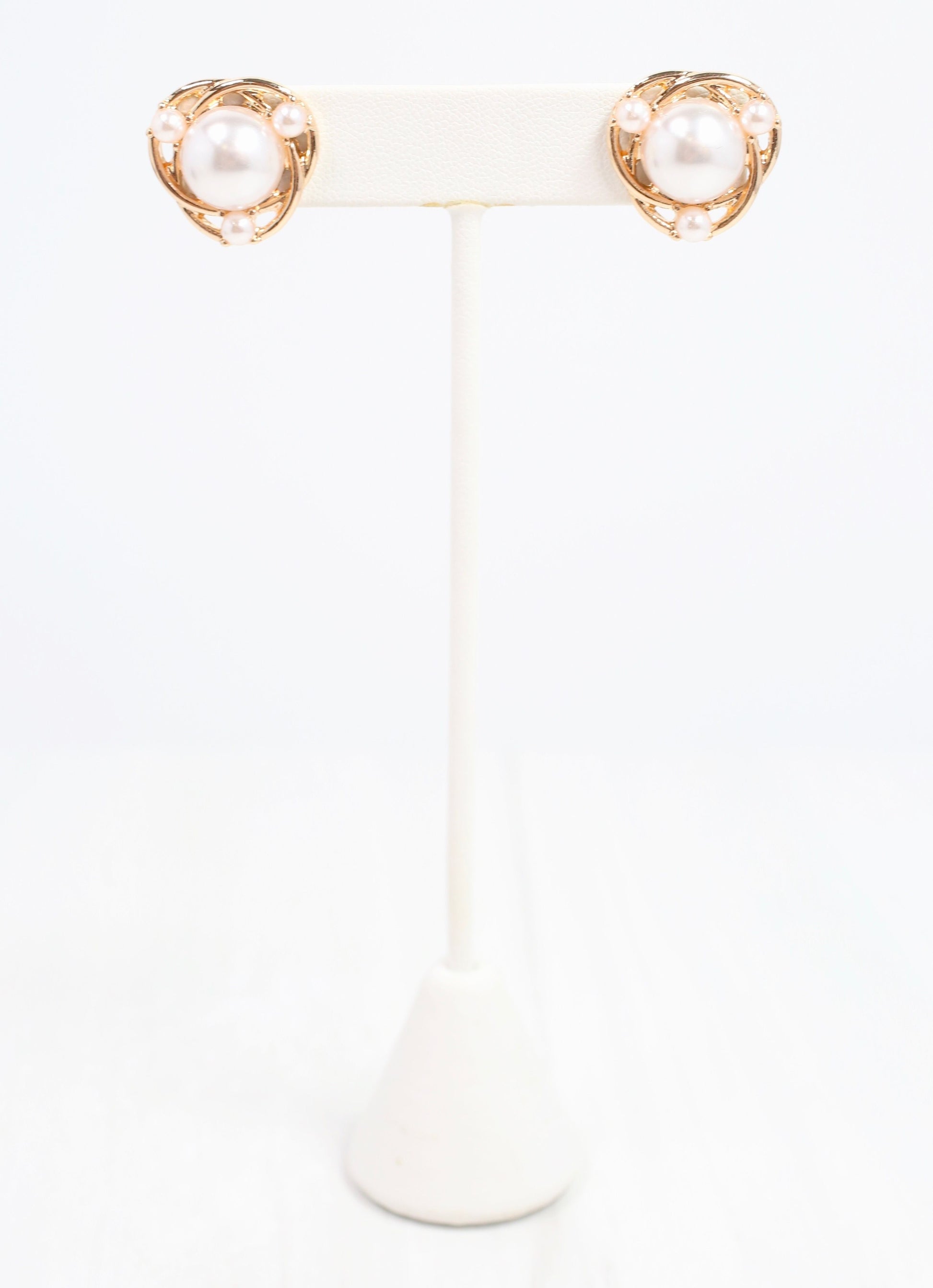 This intertwined cutout earring features a large center pearl with small pearl accents around it. Wear with any look that needs a touch of elegance.