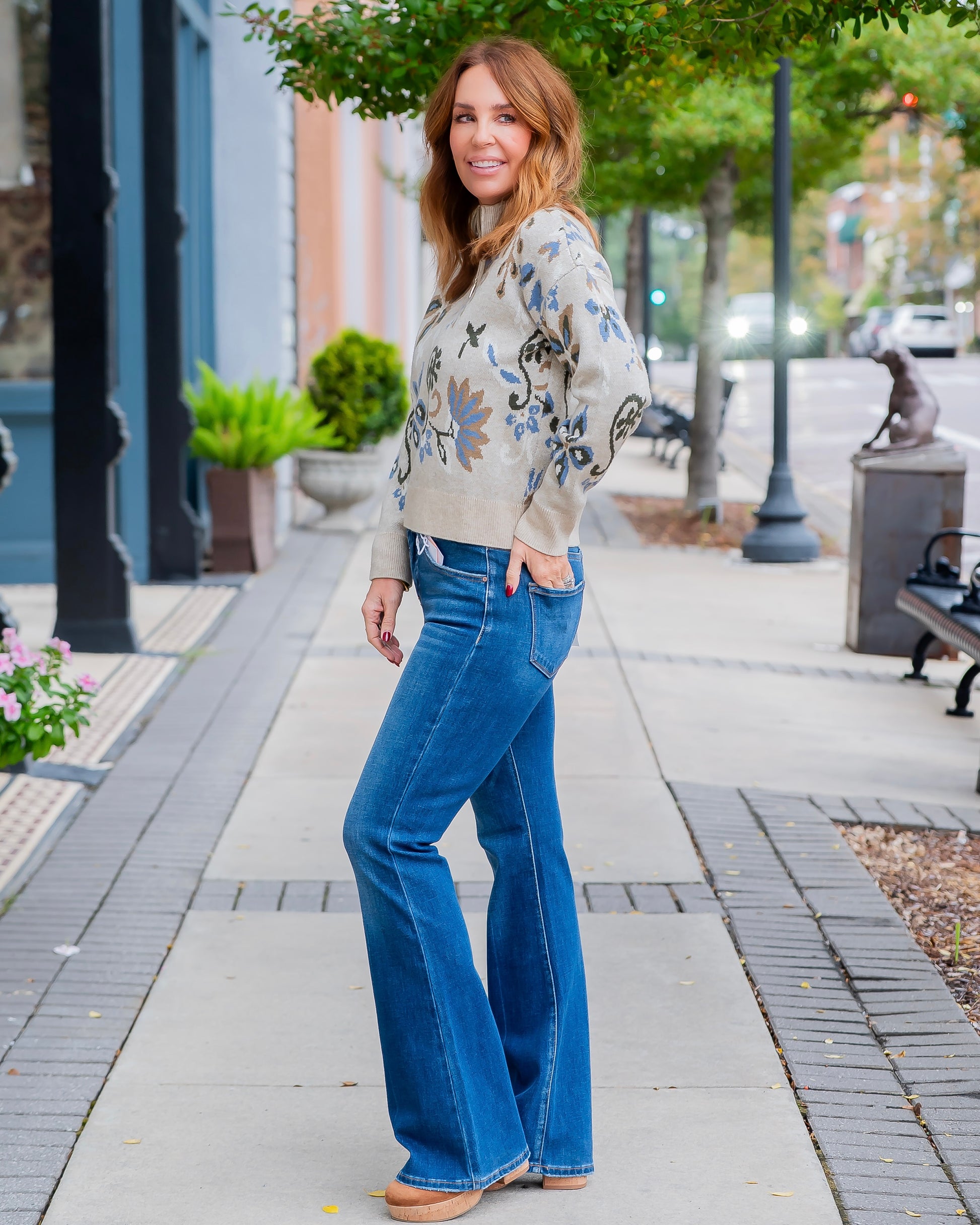 Step up your style with the Fielding Zip Front Sweater, featuring a chic mock neck with zipper detail. Its beige background is beautifully accented by teal, brown, and green botanical prints, adding a fresh and playful touch. Designed with ribbed neck, cuffs, and hem, this sweater offers a luxurious feel and comfortable fit perfect for stylish layering.
