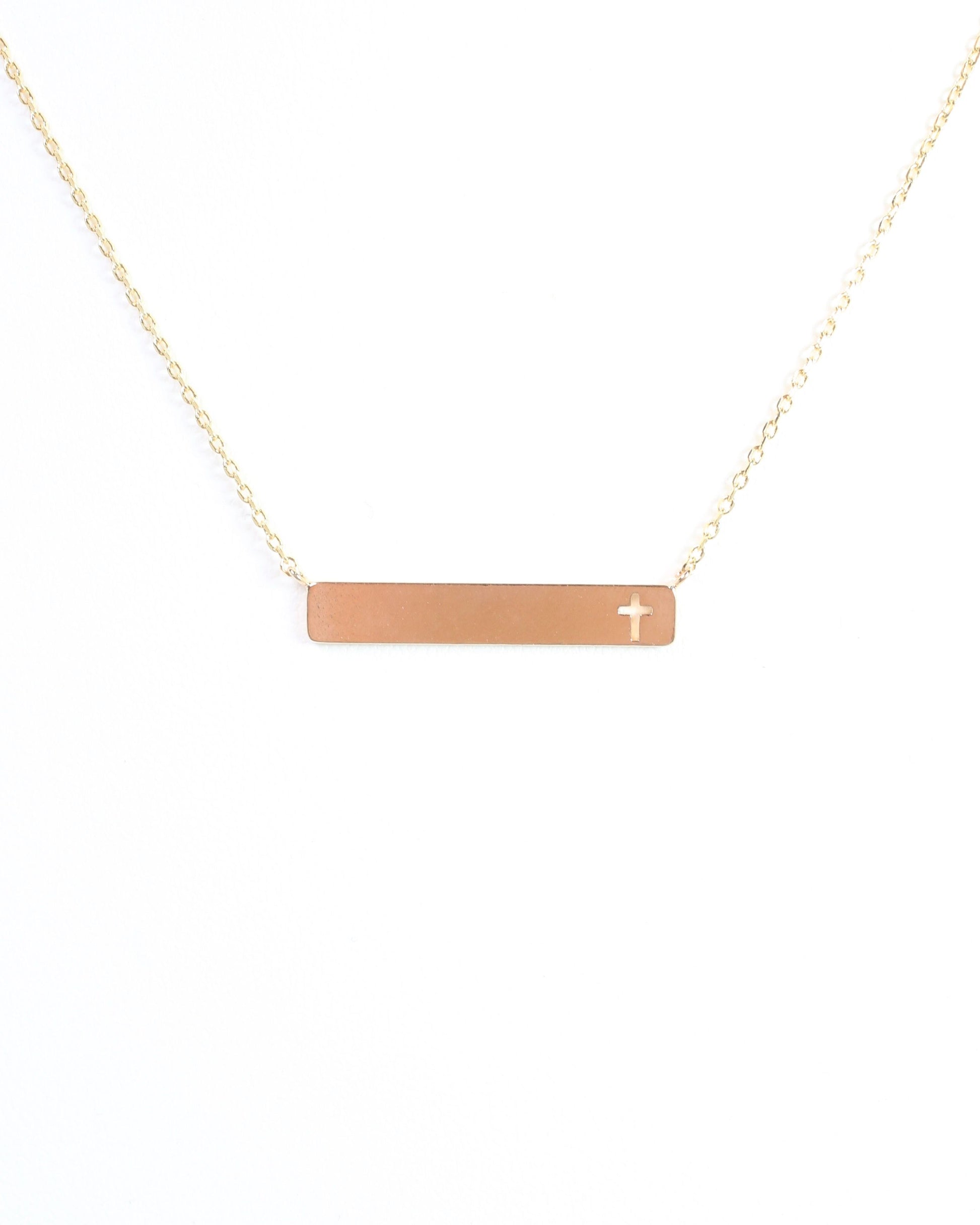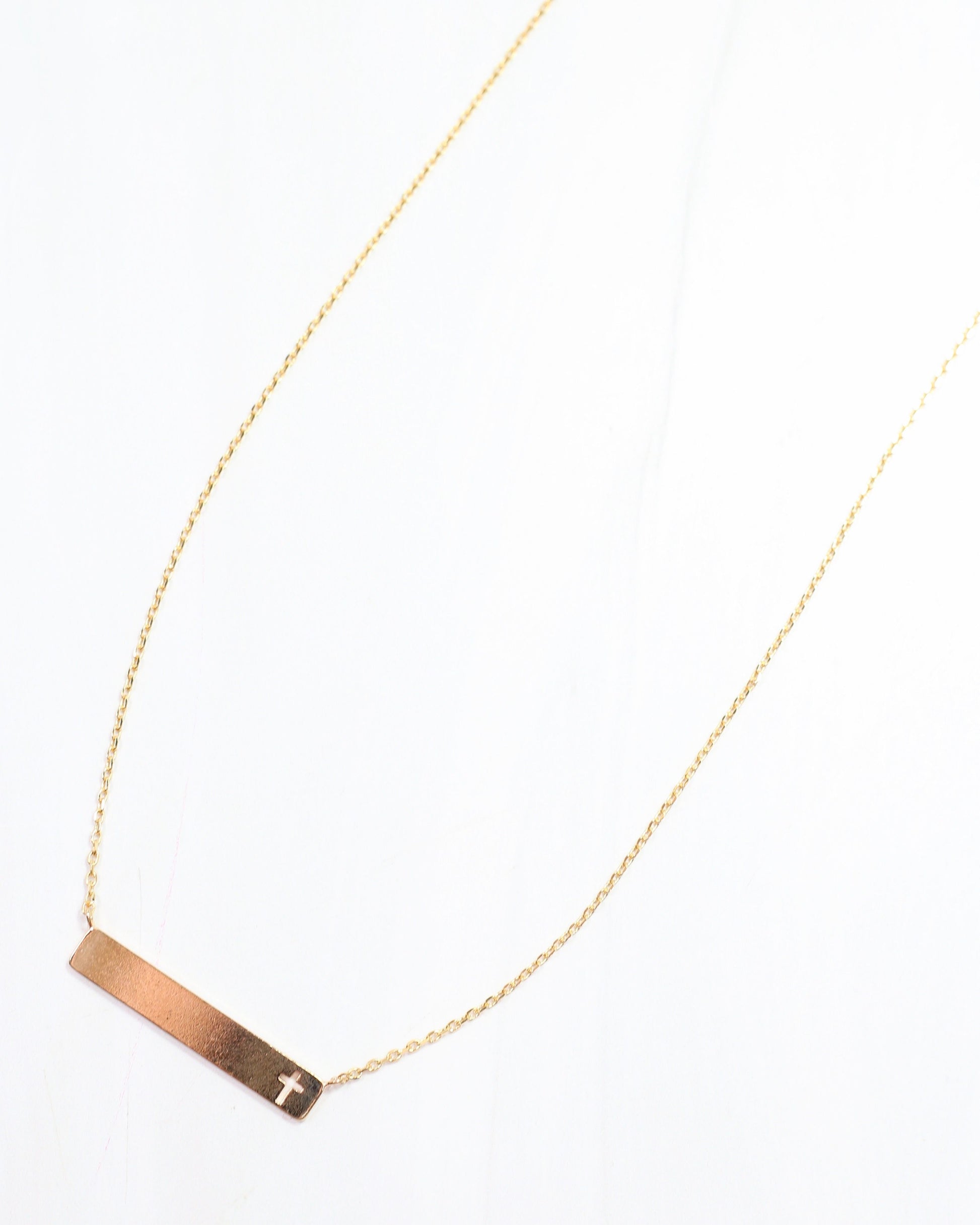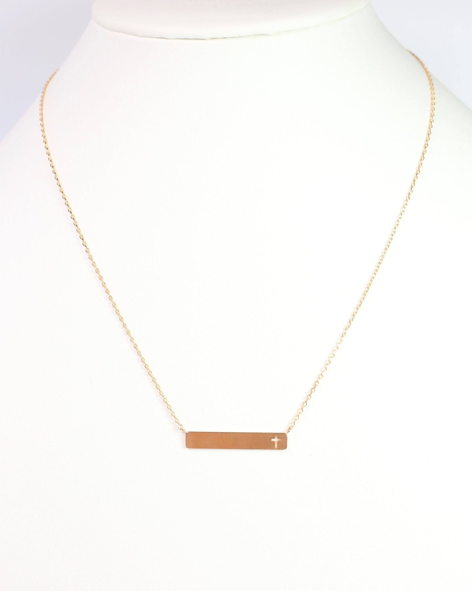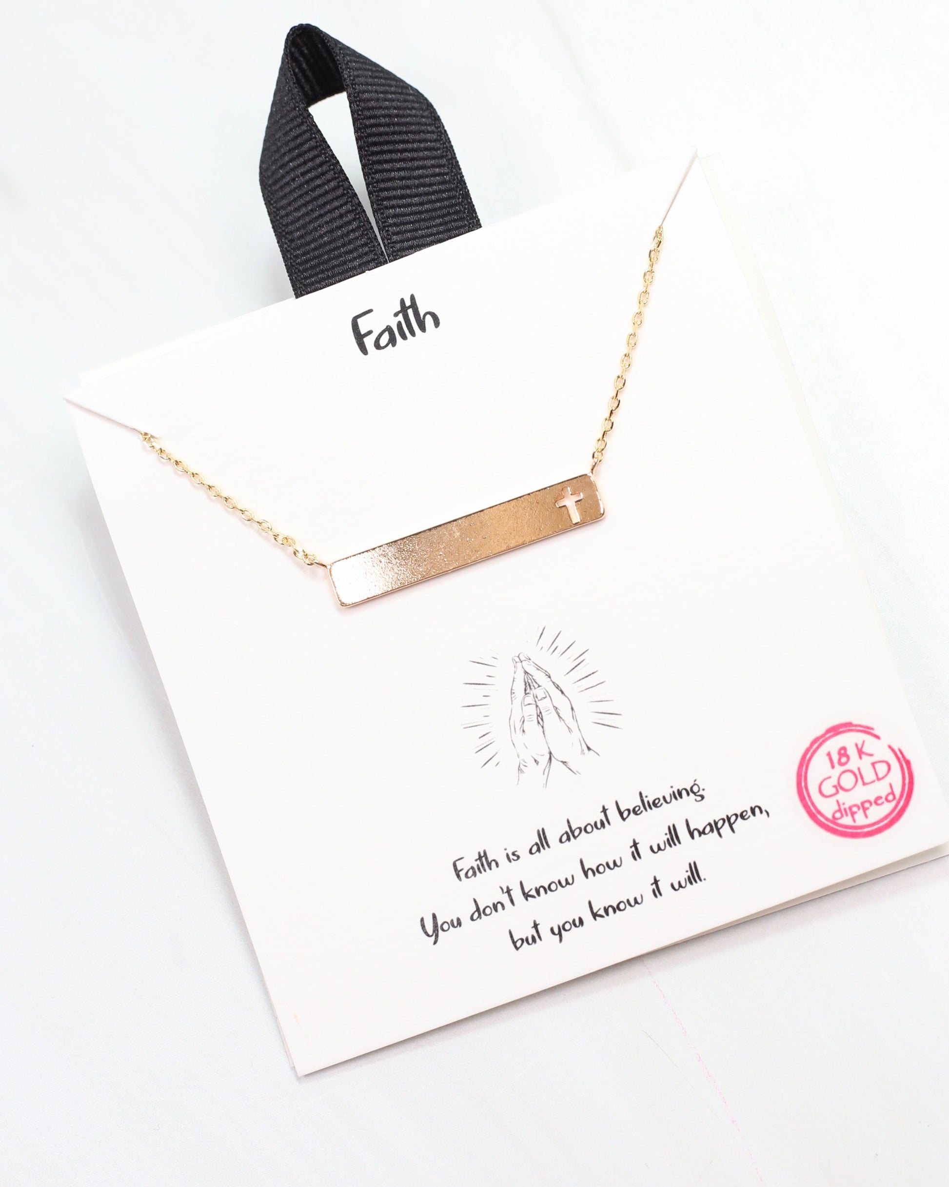 This basic necklace features a shiny gold bar with a cross cutout accent. It comes on a card that reads, "Faith is all about believing. You don't know how it will happen, but you know it will."