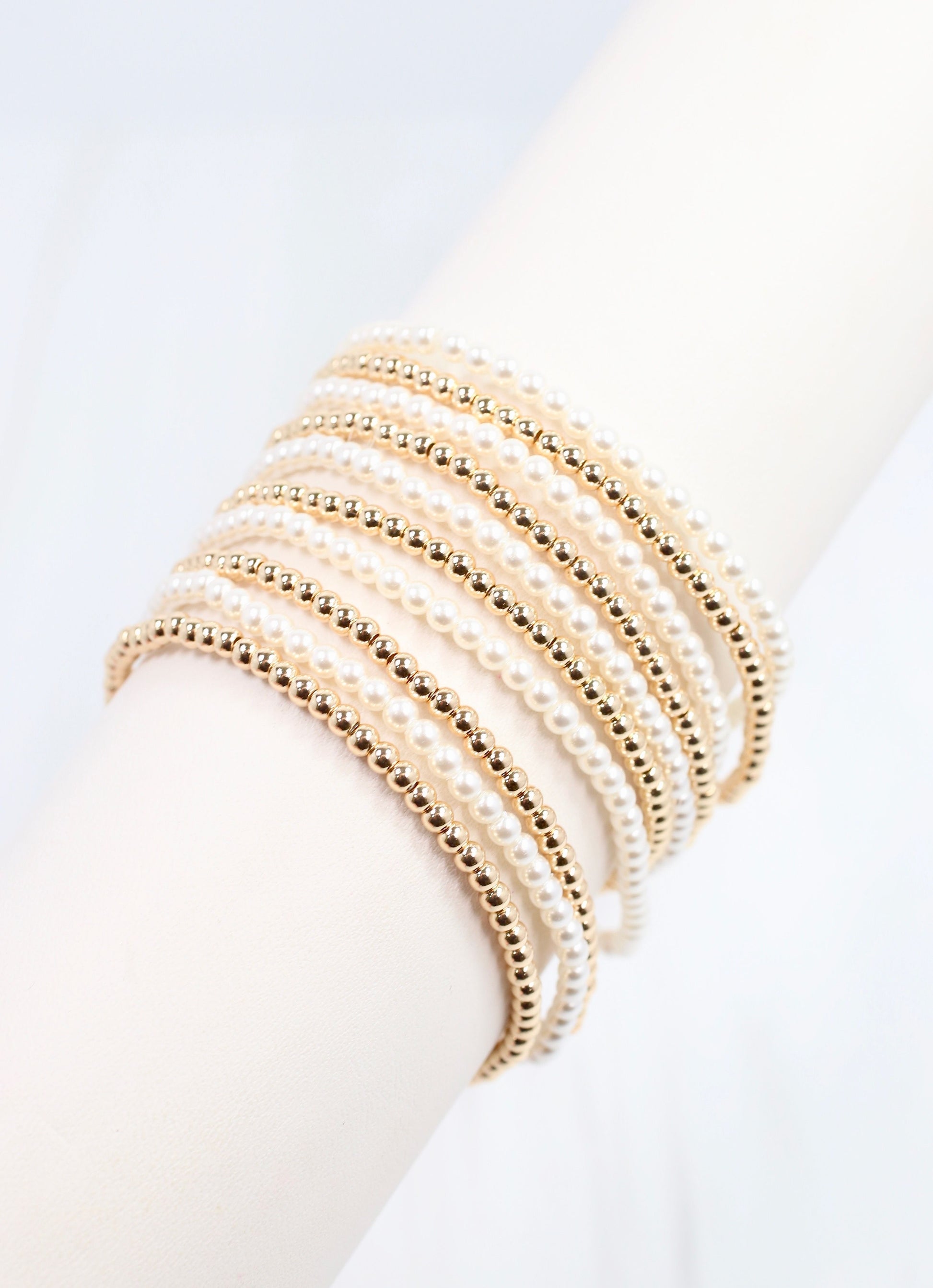 This bracelet set includes ten strands that make a fabulous stacked look. There are five gold beaded strands and five pearl strands. Stretches to fit most wrists.