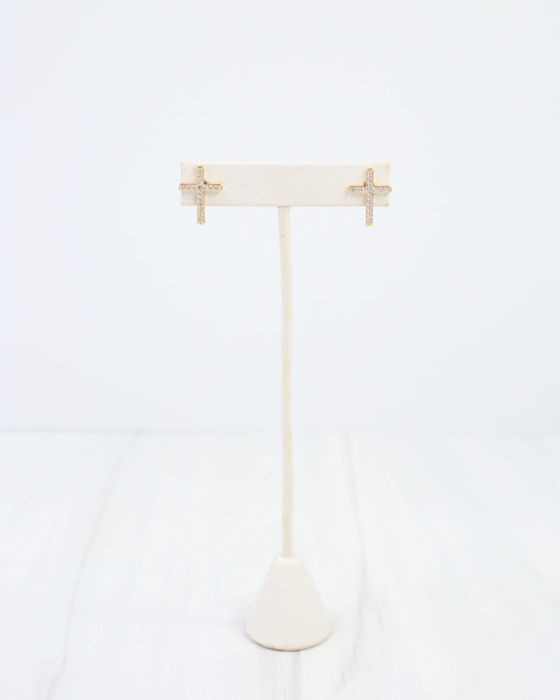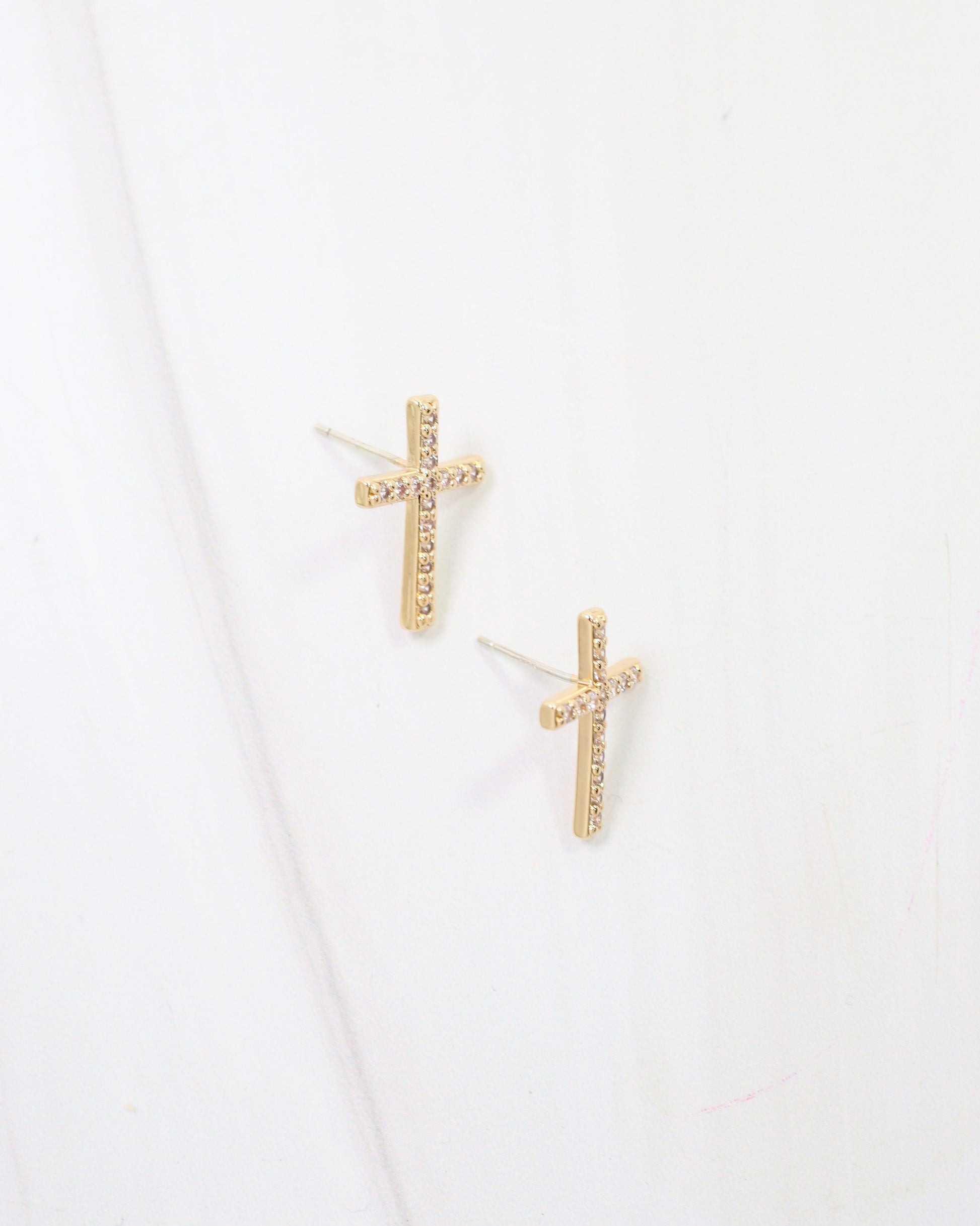 Shine with purpose in the Ferguson Rhinestone Cross Post Earrings in gold. These stunning studs feature sparkling rhinestones arranged in a cross design that catches light beautifully. Perfect for adding glamorous detail to your everyday look or making a bold statement at special events, these earrings combine spiritual symbolism with undeniable sparkle and style.