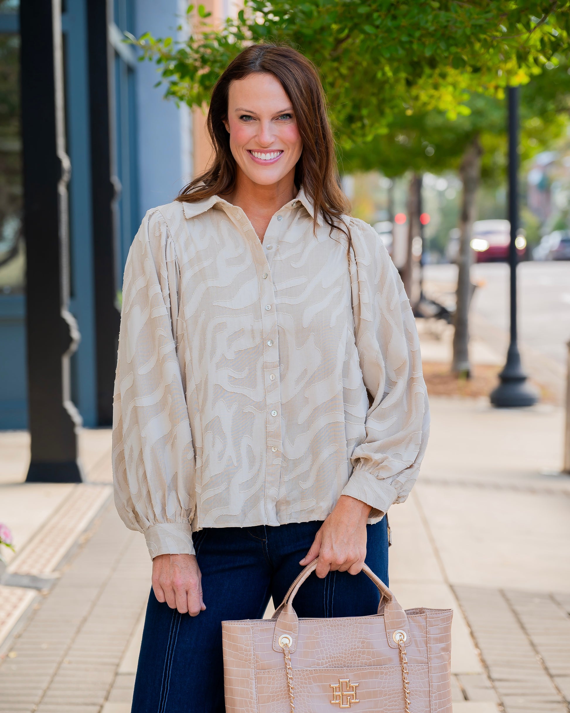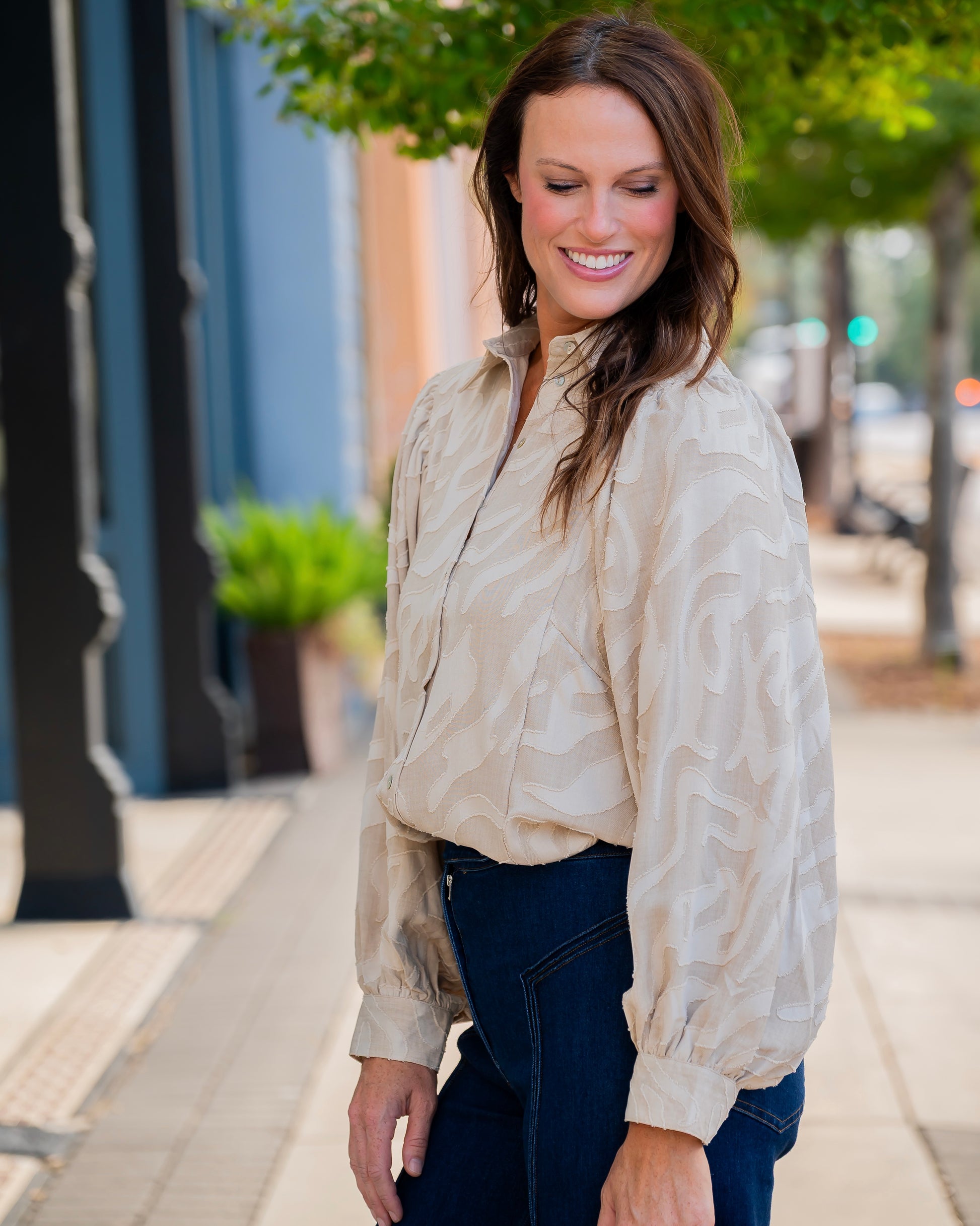 The Francey Blouse in Taupe features a refined green tone-on-tone textured design accented with decorative stitching that subtly highlights its elegant details. It boasts a classic button-down collar and a gathered long sleeve, combining timeless style with a sophisticated, polished look ideal for any occasion.