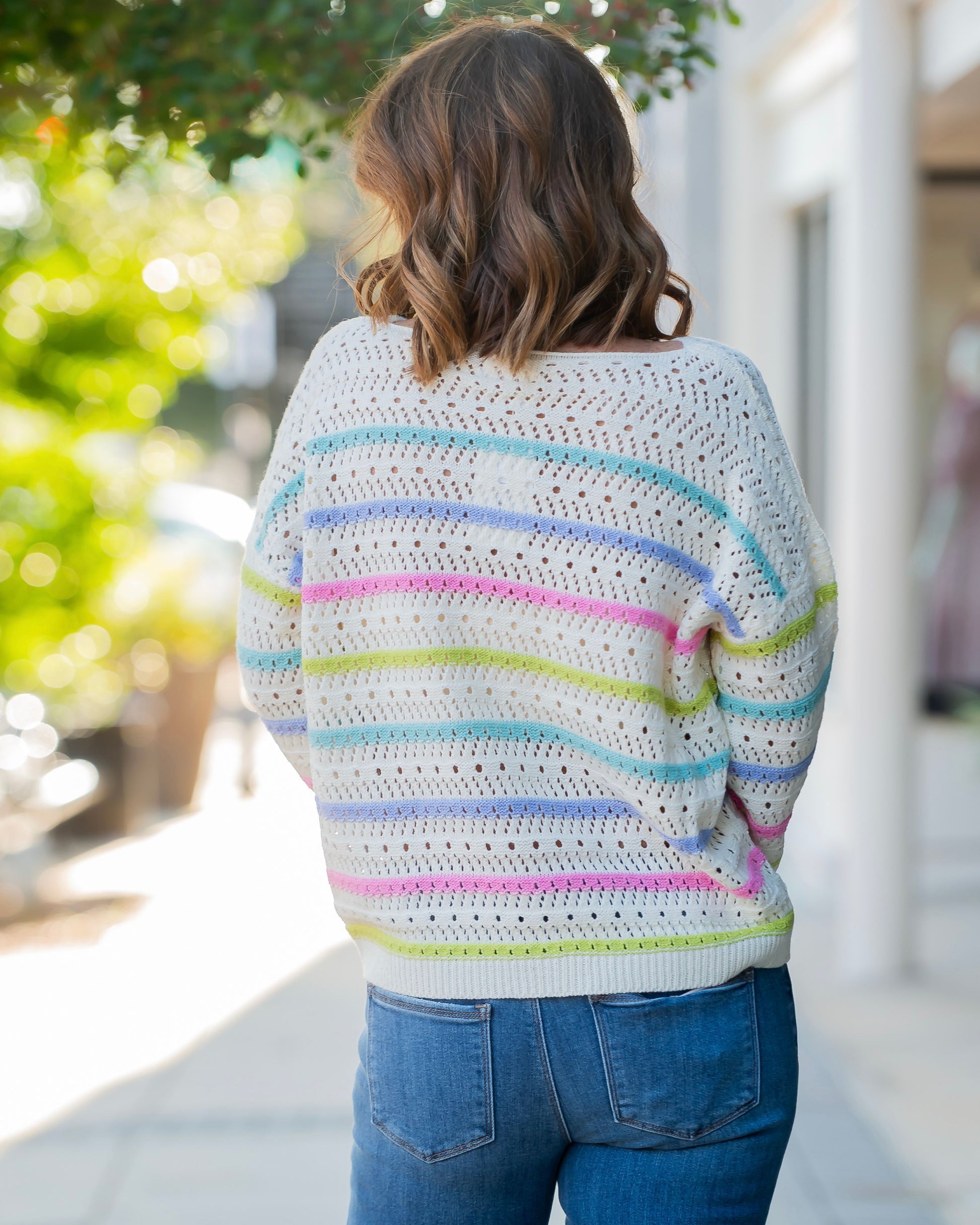 Meet your new go-to layering essential—the Galena Stripe Pattern Open Knit Sweater. This charming piece showcases a vibrant rainbow of horizontal stripes in blue, purple, pink, mint, and green, all set against a neutral beige canvas. The open knit construction keeps things light and breezy, making it perfect for throwing over basics or wearing solo when the weather cooperates. Mix, match, and make a colorful statement with this fun, effortlessly cool sweater.