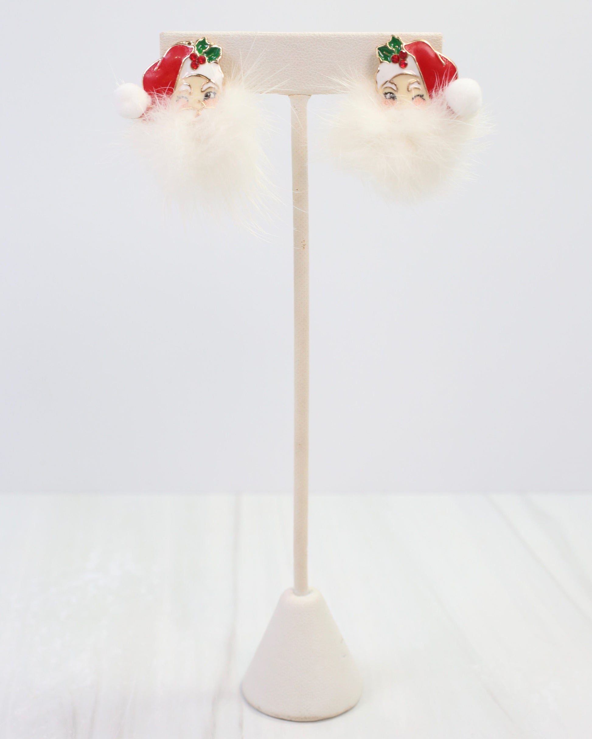 The Fuzzy Santa Earrings in red showcase a vintage enamel Santa stud with a soft faux fur beard and a playful pom-pom on his red hat, adding a fun and fashionable flair to your holiday accessories.