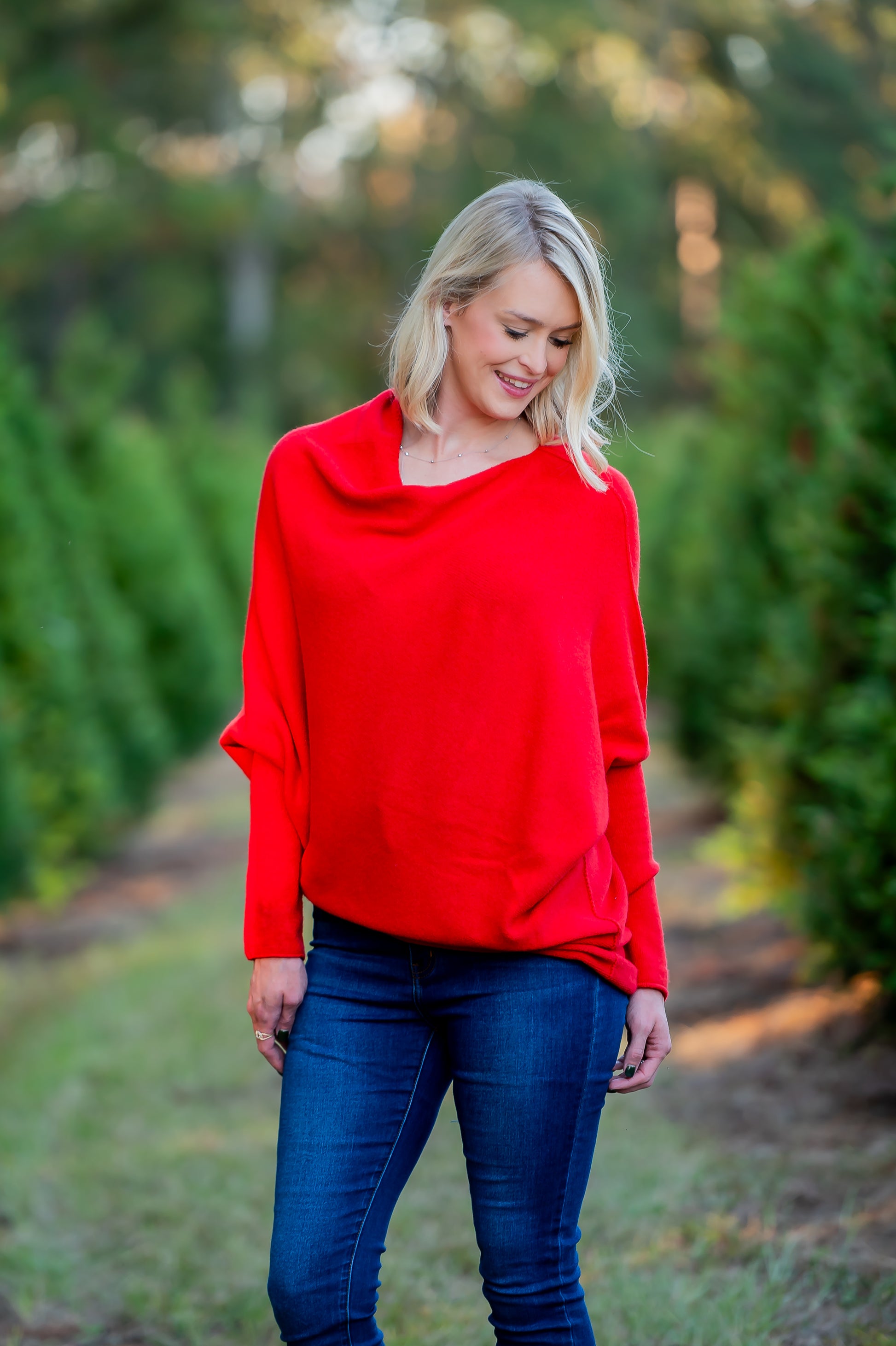 Elevate your wardrobe with the Gramercy Asymmetrical Sweater in vibrant red. This long-sleeve design features a stylish asymmetrical mock neck that creates a flattering silhouette. Its versatile fit allows you to wear it on or off the shoulder, seamlessly transitioning from casual days to elegant evenings. Crafted in Italy, this sweater combines modern fashion with timeless quality, making it an essential piece for your fall and winter collection.