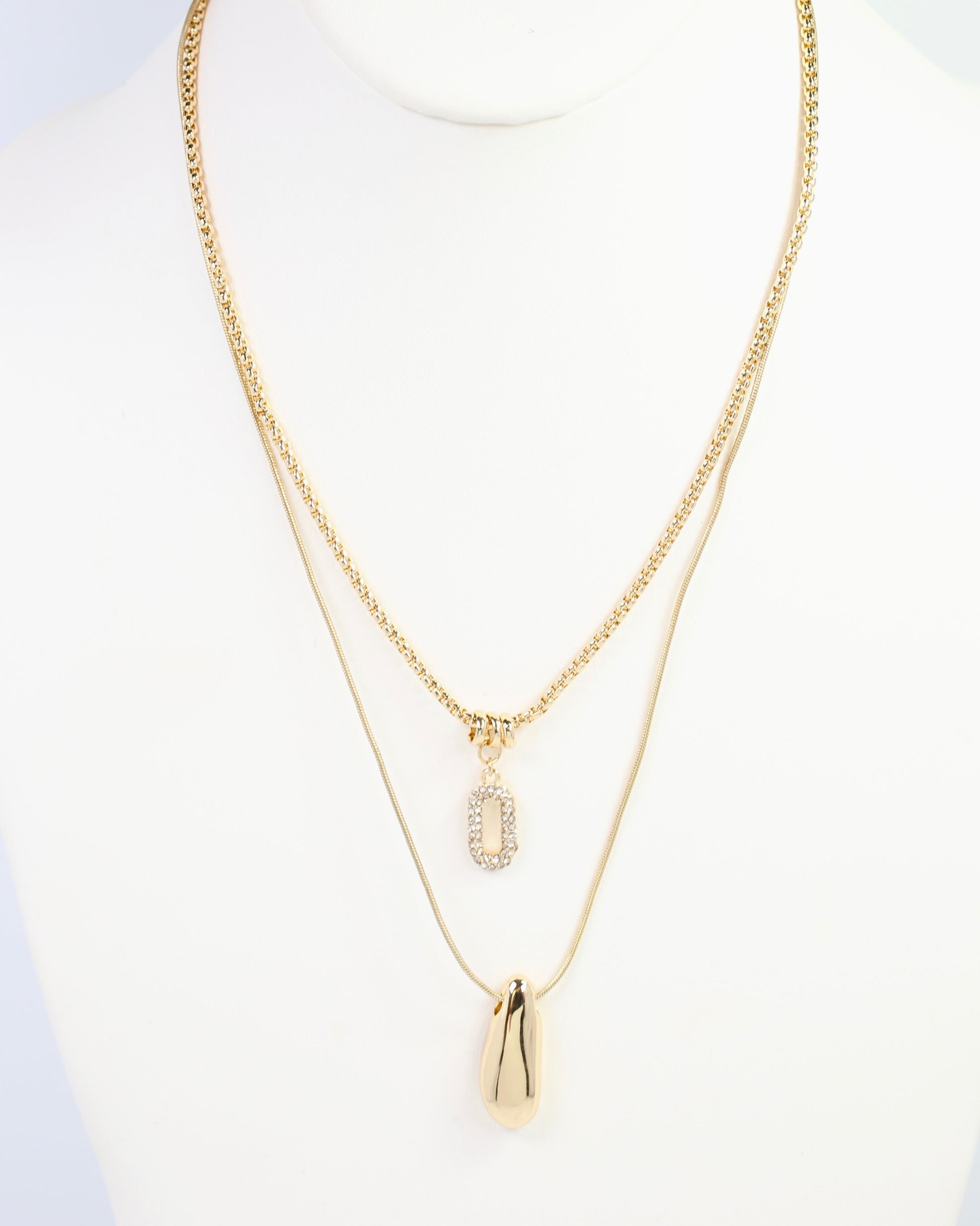 The Greenwich Layered Pendant Necklace in Gold combines a sleek snake chain with an oblong gold pendant and a shorter round chain featuring two spacers and a pave oval pendant. This stylish two-layer design adds a fashionable and fun flair to any look, perfect for effortless layering.