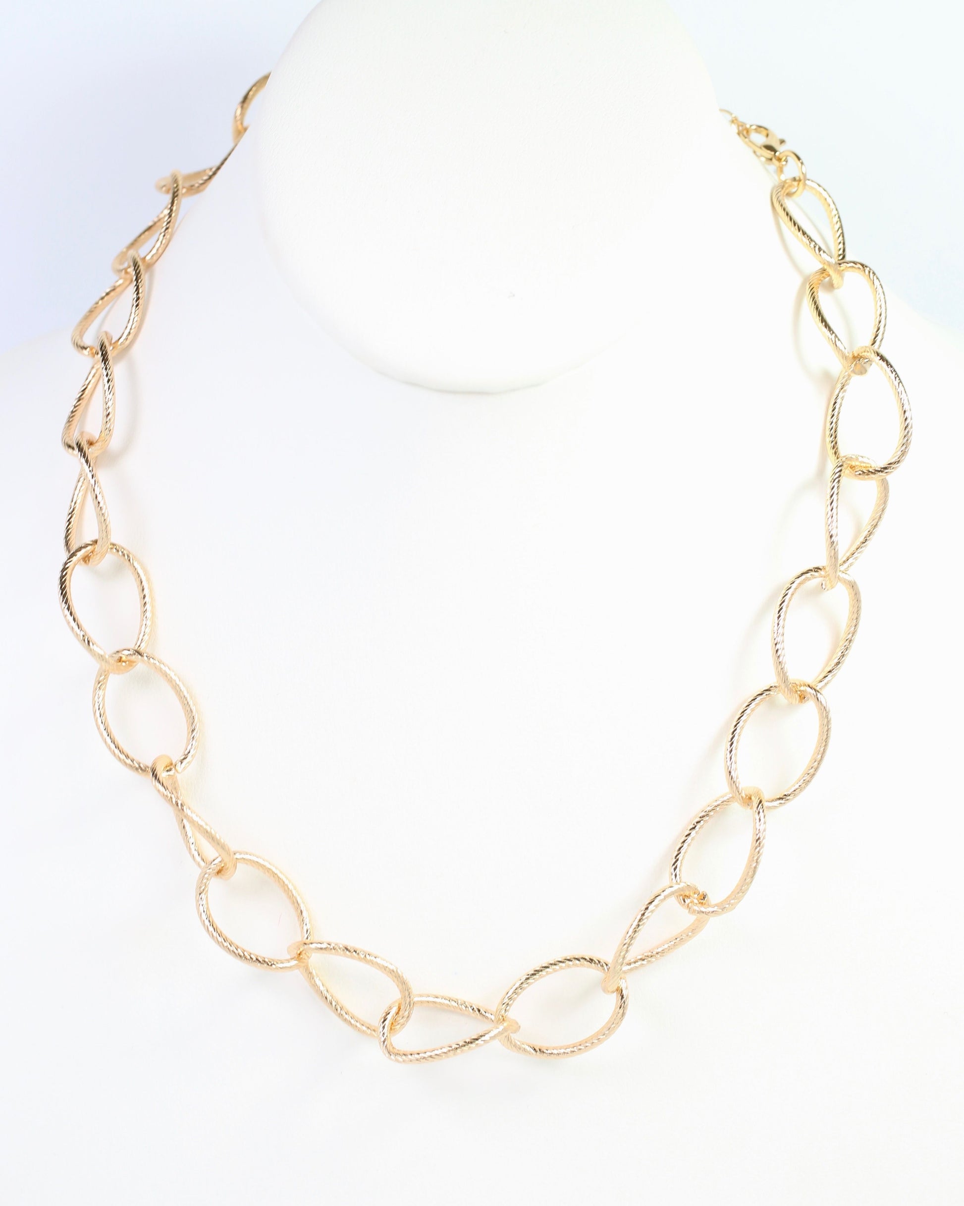 Elevate your style with the Greenwich Textured Oval Chain Necklace in Gold. This lightweight necklace features charming oval links with a subtle scratch texture, adding a unique touch to any outfit. Perfect for layering, it effortlessly blends with other pieces to create a fashionable, fun look that’s ideal for everyday wear or special occasions.
