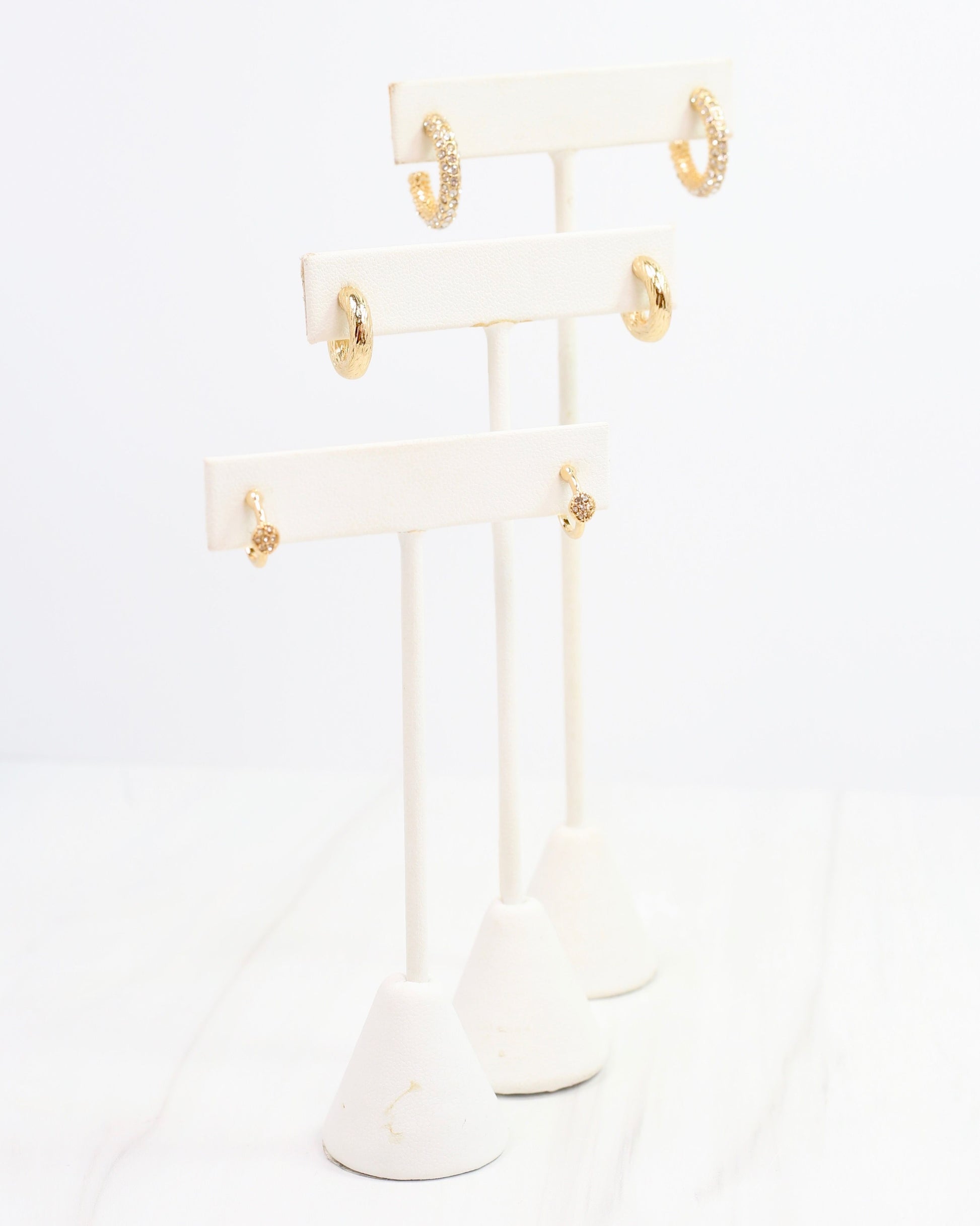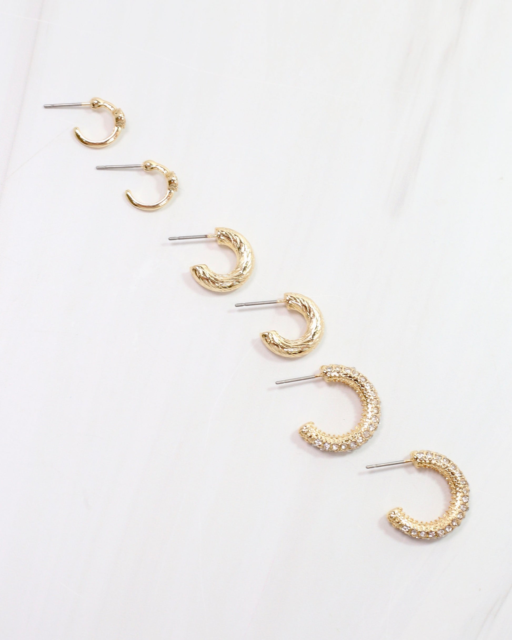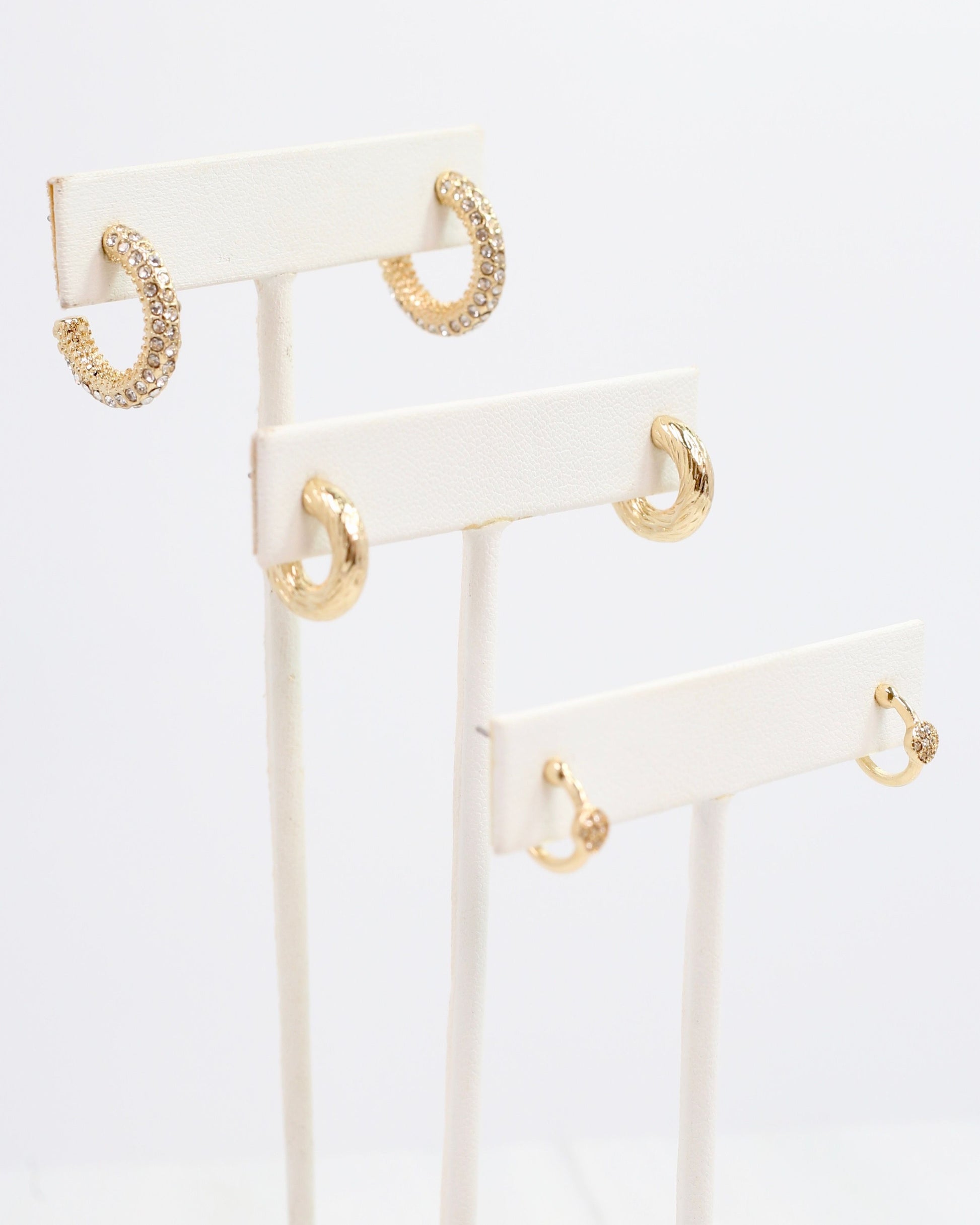Make a statement with our Gwendolyn Hoop Earring Set in Gold! Featuring three pairs of classic hoops with unique details, these earrings are perfect for everyday wear. The largest pair is adorned with dazzling pave stones, while the mid-sized pair has a trendy twisted texture. The smallest pair adds a touch of sparkle with a delicate pave circle. Upgrade your earring game with our Gwendolyn set!