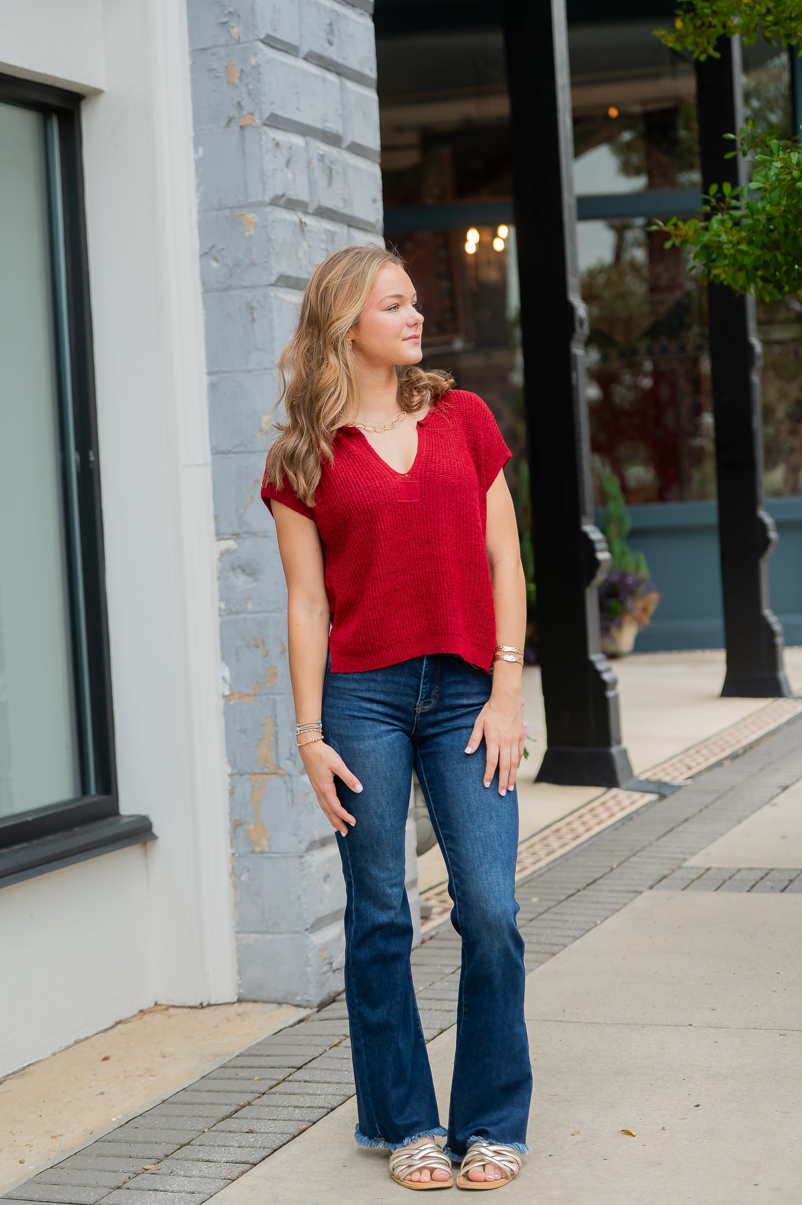 The Harlan Split Neck Sweater Top in vibrant red combines modern style with comfort. Featuring a distinctive split neckline and batwing short sleeves with extended shoulders, this sweater knit top offers a relaxed yet fashionable silhouette. Raw edge detailing adds an edgy touch, while the solid color and unlined design make it a versatile piece for effortless layering or standalone wear.