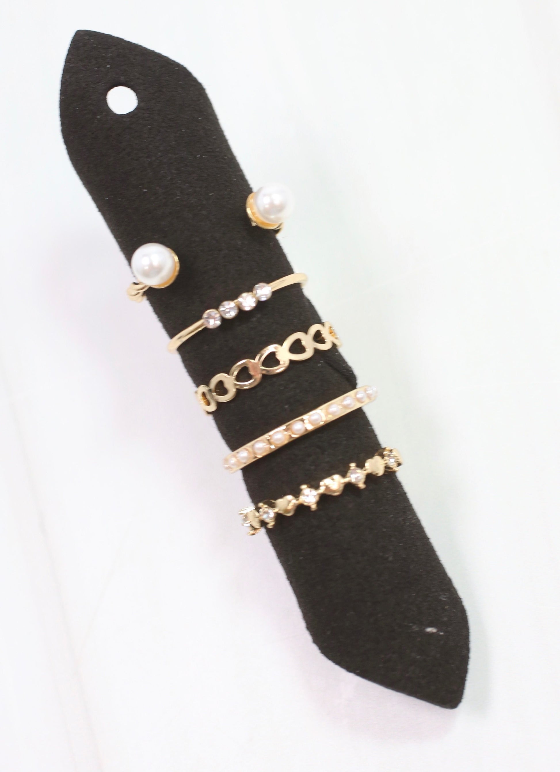This gold ring set includes five pieces each with their own unique look. They complement each other so well making them perfect to wear together or on their own.