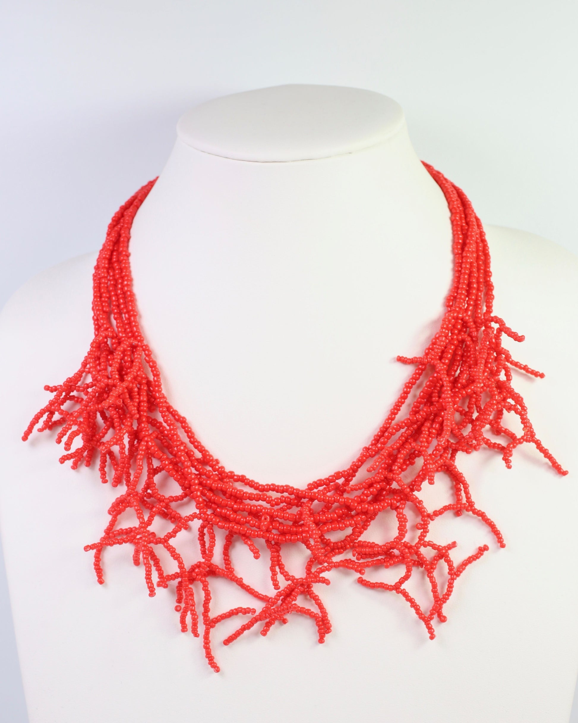 The Highland Seed Bead Layered Necklace in vibrant red makes a bold fashion statement. Delicate seed beads create intricate layers that catch the light beautifully, adding depth and movement to your look. This eye-catching piece works perfectly as a standalone accent or layered with complementary jewelry for a personalized, on-trend aesthetic.