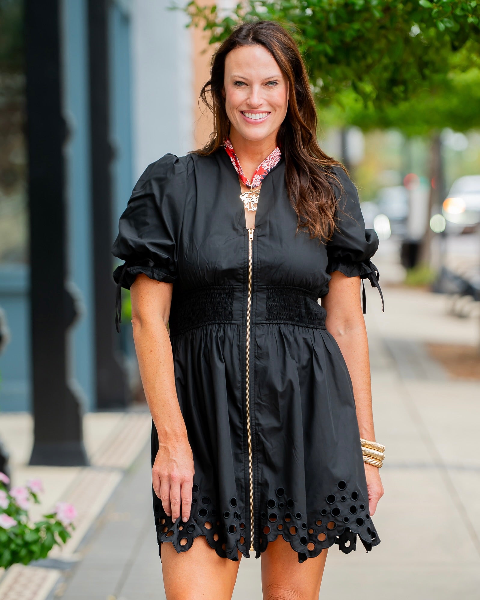 The Leeds Zip Front Dress in black is a playful dress featuring puff sleeves with a decorative tie and a flattering V-neckline. The smocked waist enhances your silhouette, while the scallop eyelet hem adds a touch of charm. A convenient front zipper closure makes it easy to wear. Perfect for a fun, fashionable look that stands out effortlessly.