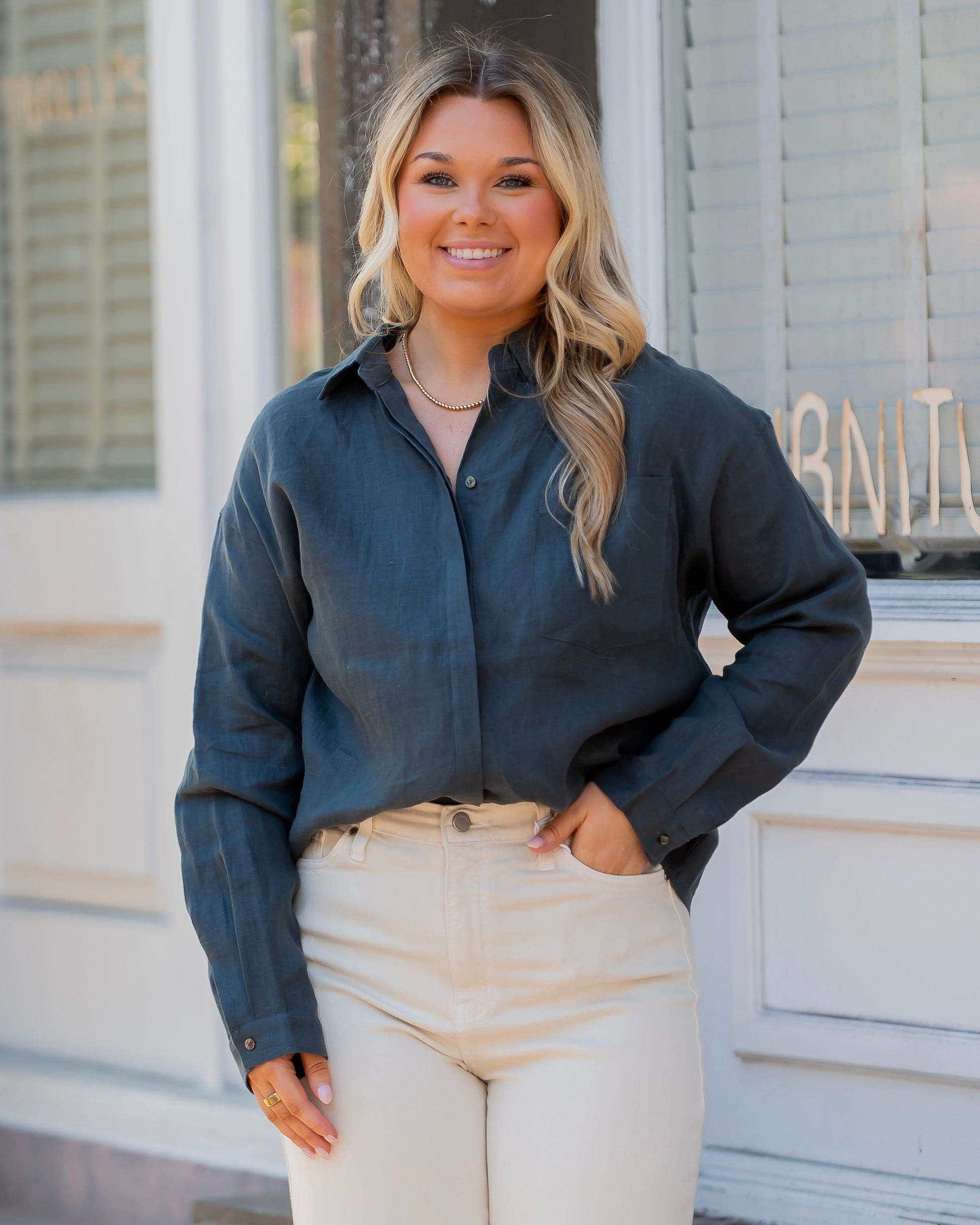 Introducing the Jackson Linen Blouse in a stunning deep teal blue—your new wardrobe essential. Crafted from the most wonderful linen fabric, this effortless piece features a classic button-down front with a hidden placket that keeps buttons neatly concealed. The crisp shirt collar and comfortable cuff sleeves offer timeless style, while a practical front pocket adds everyday functionality. Perfect for layering or wearing solo, this blouse transitions seamlessly from casual weekends to polished workdays with undeniable charm.