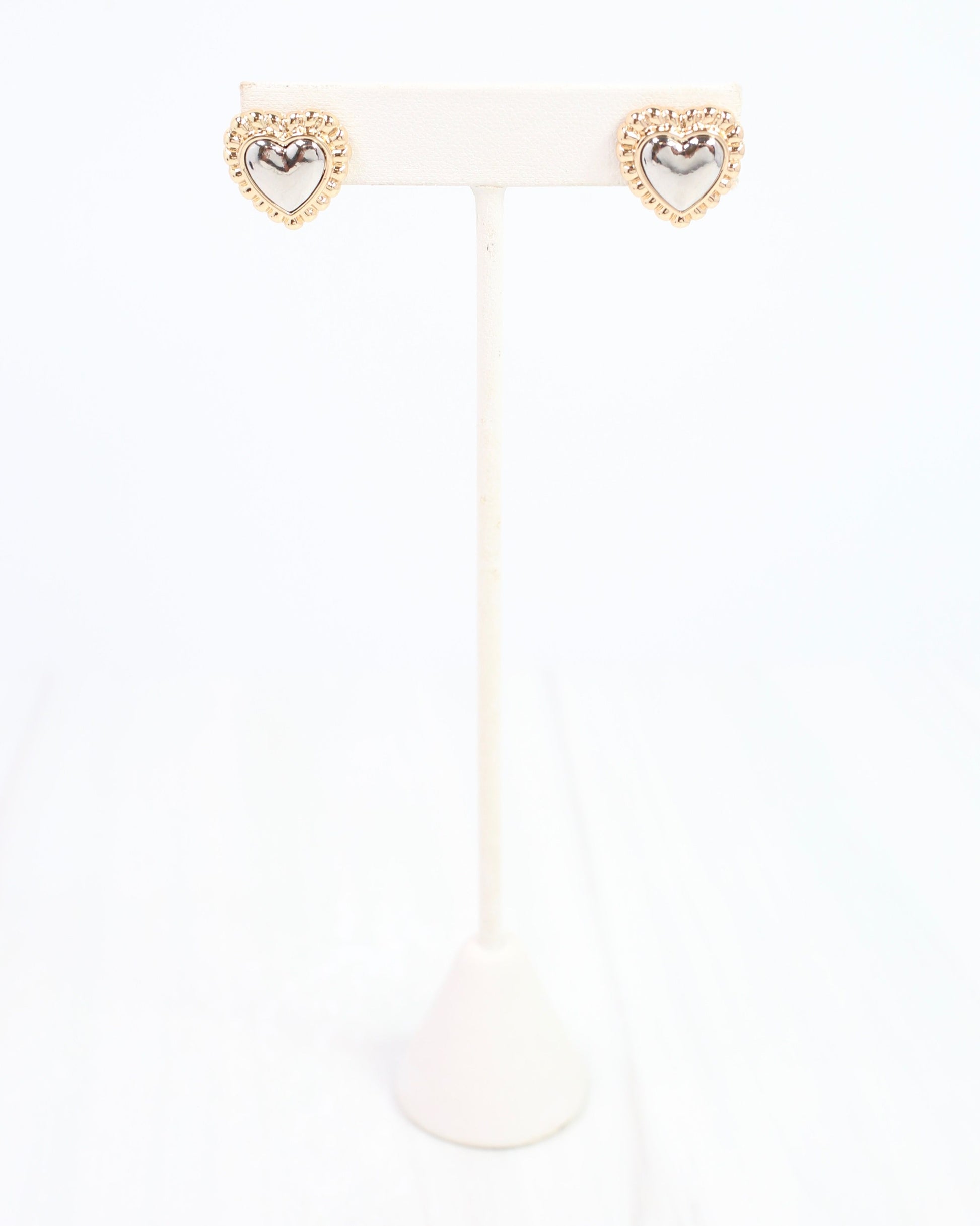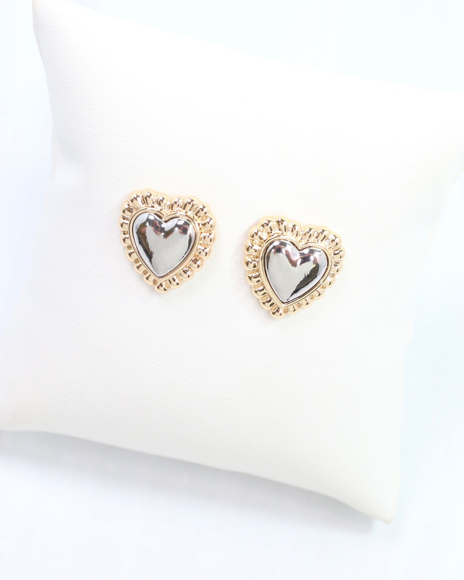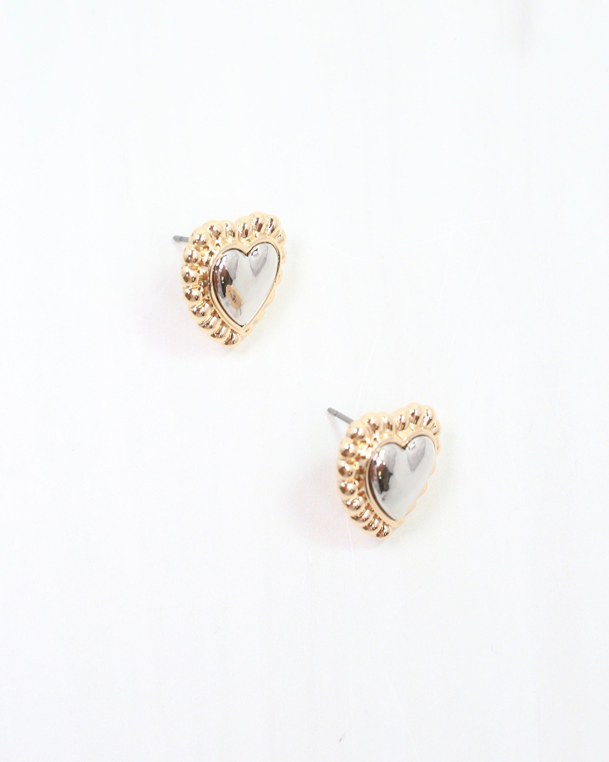 Add a touch of charm with the Howell Heart Stud, where shiny silver meets gold ribbed edges for a playful mix of metals. These adorable studs brighten any outfit with their sparkling contrast and sweet heart shape, making them perfect for everyday fun or special moments.