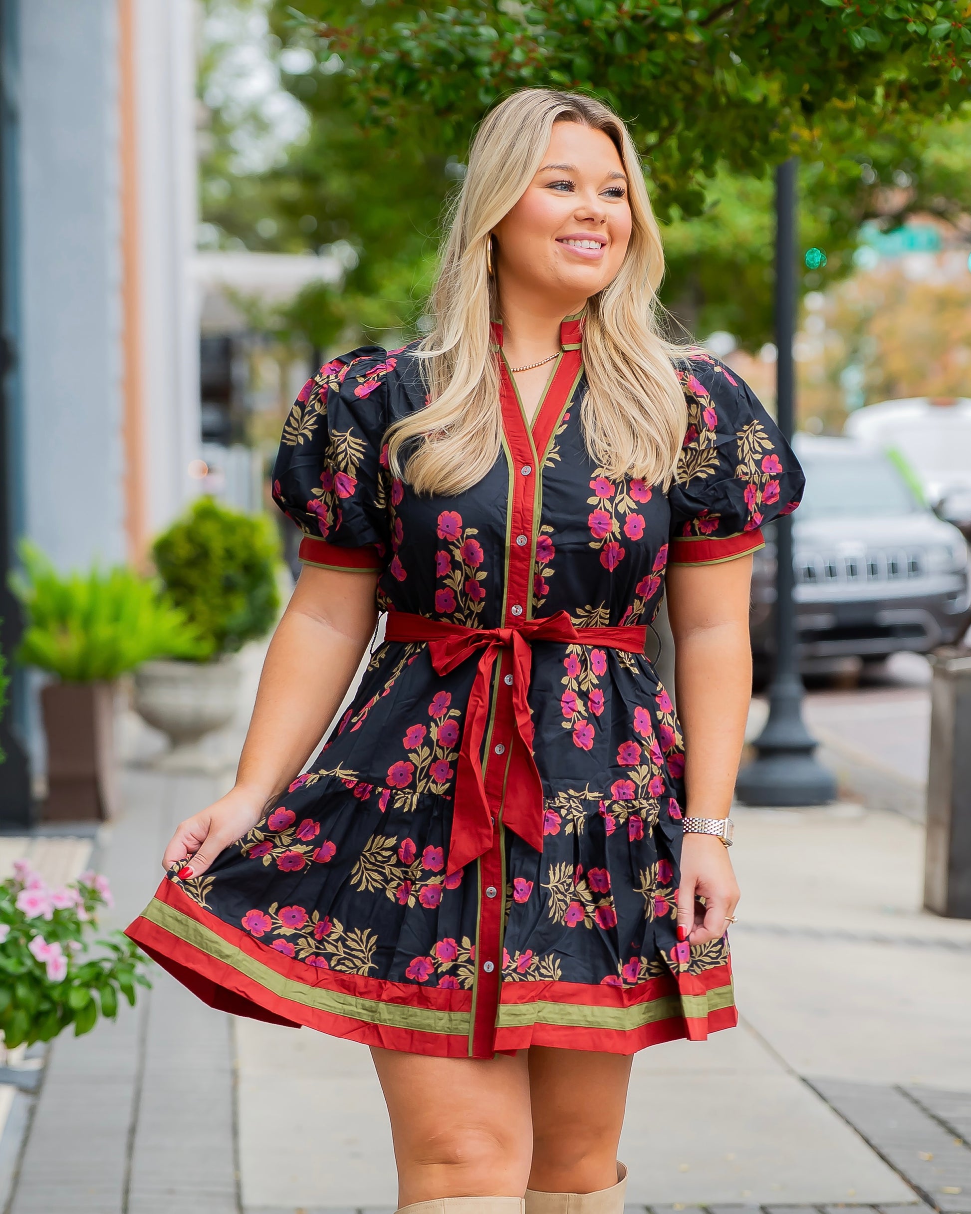 Step out in style with the Irvin Floral Dress featuring a striking black background adorned with garnet and olive blooms. This fun, fashionable mini dress offers short puff sleeves and a playful ruffle hem, enhanced by a multicolor accent band for a chic twist. The V-neck with a band collar and button closure adds subtle sophistication, while the removable belt cinches your waist for a flattering fit. Has pockets for a practical flair.