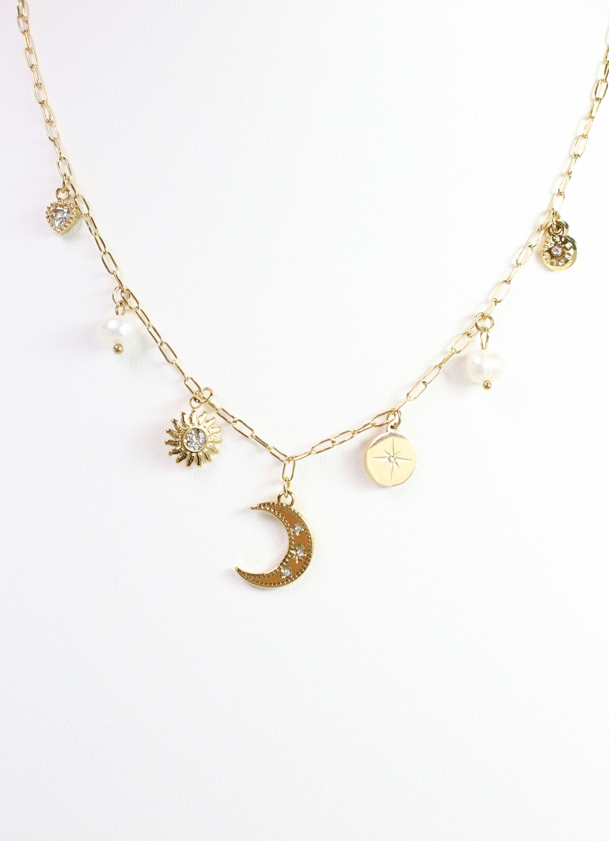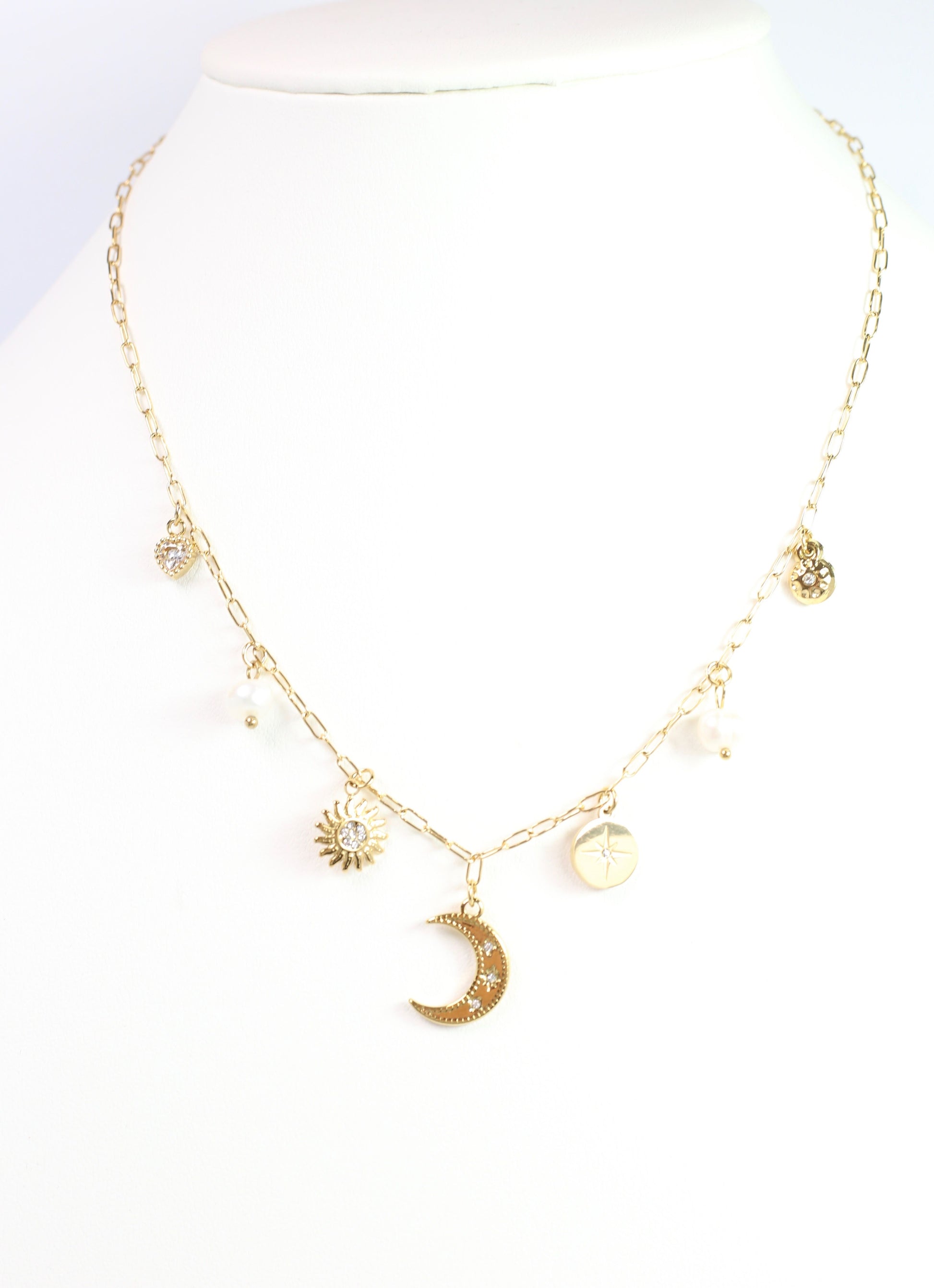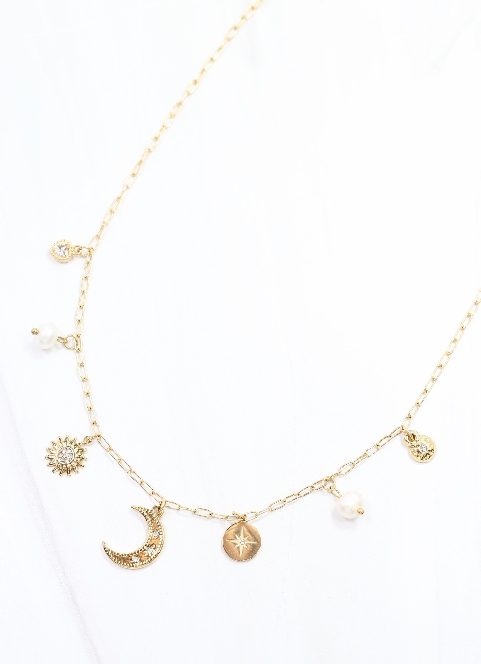 This worn gold thin necklace features celestial themed charms that are a great size for a perfectly on trend look.