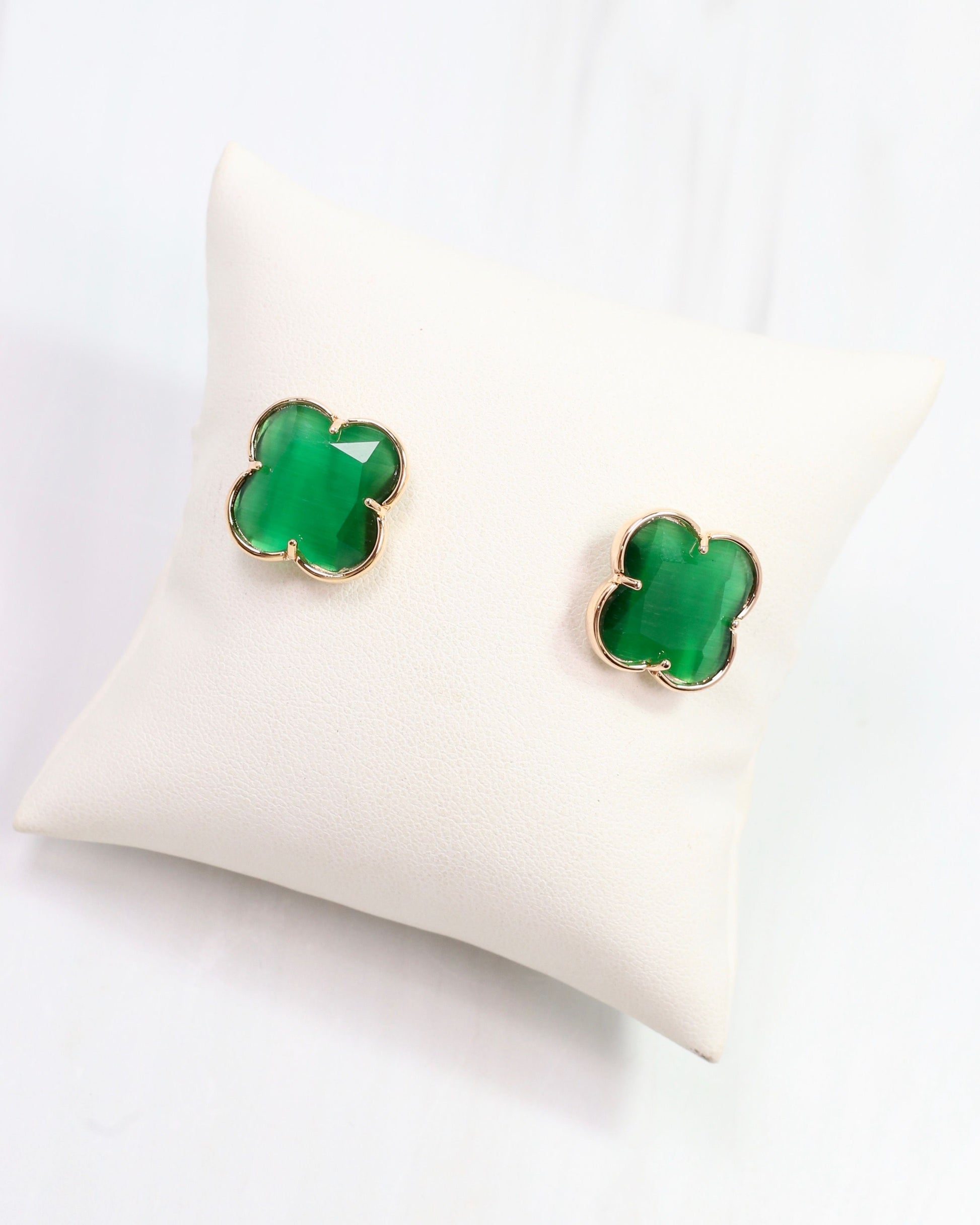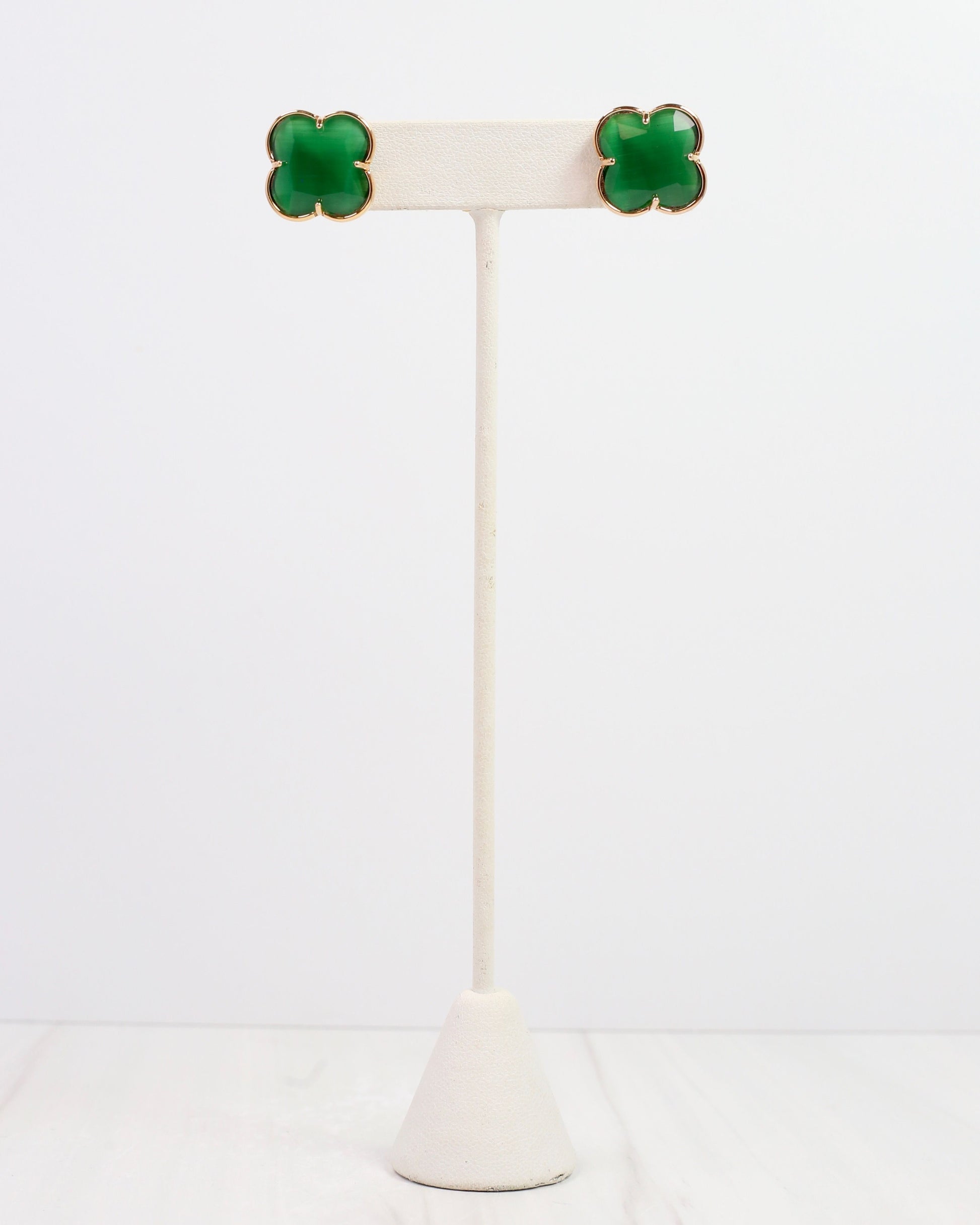 Add a pop of playful charm with the Jonsey Clover Post Earrings in vibrant green. Featuring a faceted clover-shaped stone framed in gleaming gold trim, these earrings bring a fresh, festive touch to any outfit. Perfect for holiday sparkle or elevating your everyday style with a lucky twist.