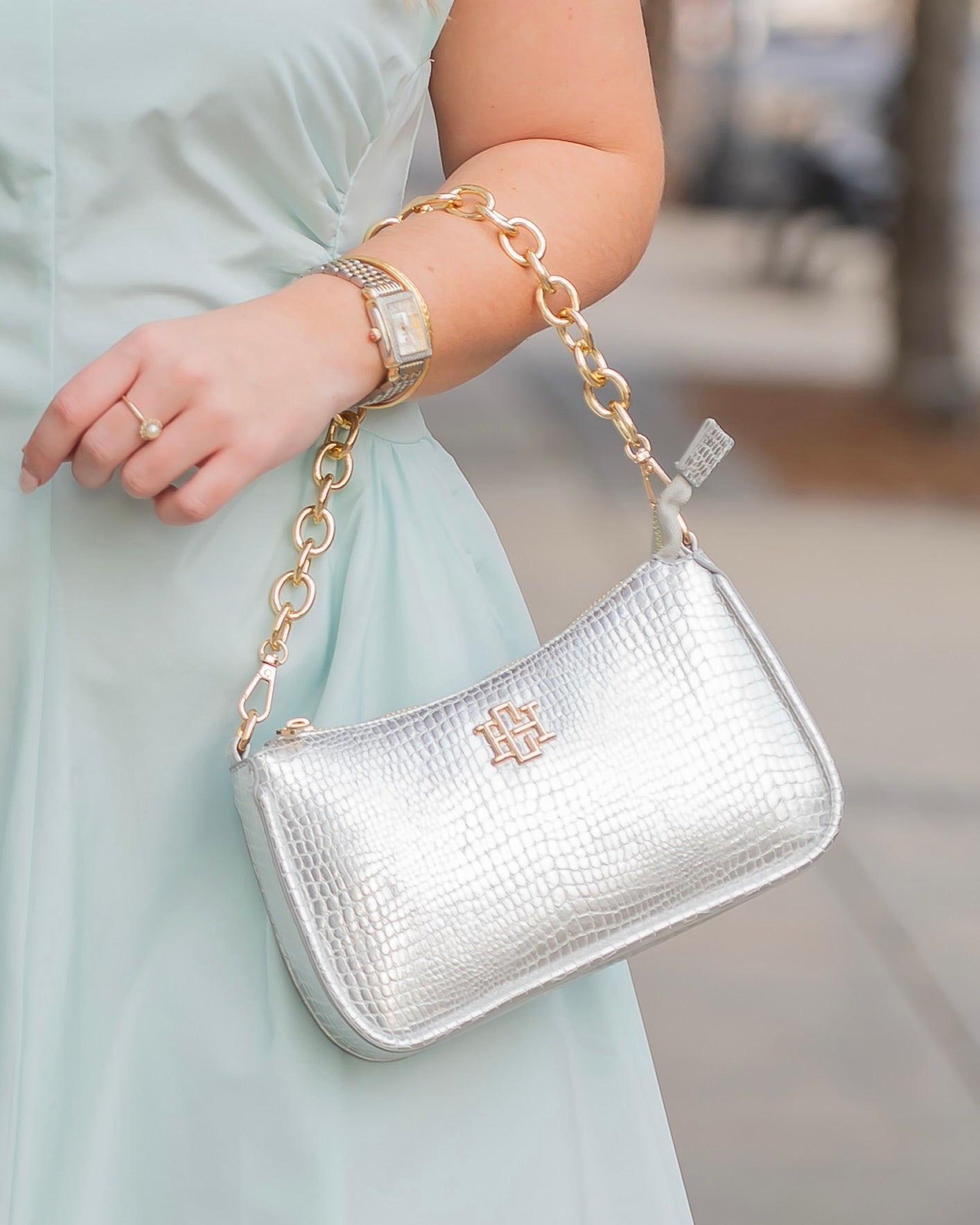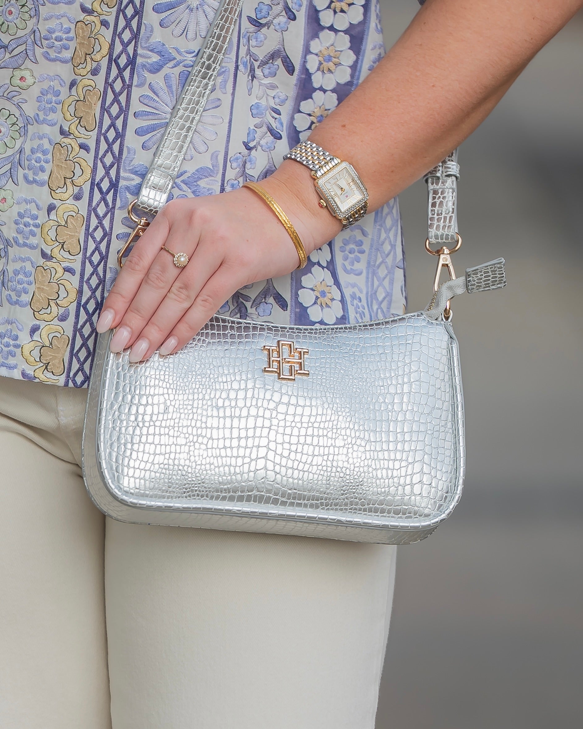 The Joan Crossbody in Silver EC. This fabulous vegan croc crossbody is a wonderful size for travel and everyday wearing! It is made with a croc, vegan leather that is oh so soft. There is a removable chain accent that can also be used as a carrying strap as well. The crossbody strap is adjustable and removable as well. It features the Caroline Hill logo on one side and has a top zipper closure. The interior of the bag has a zippered pocket and two short open pockets as well.