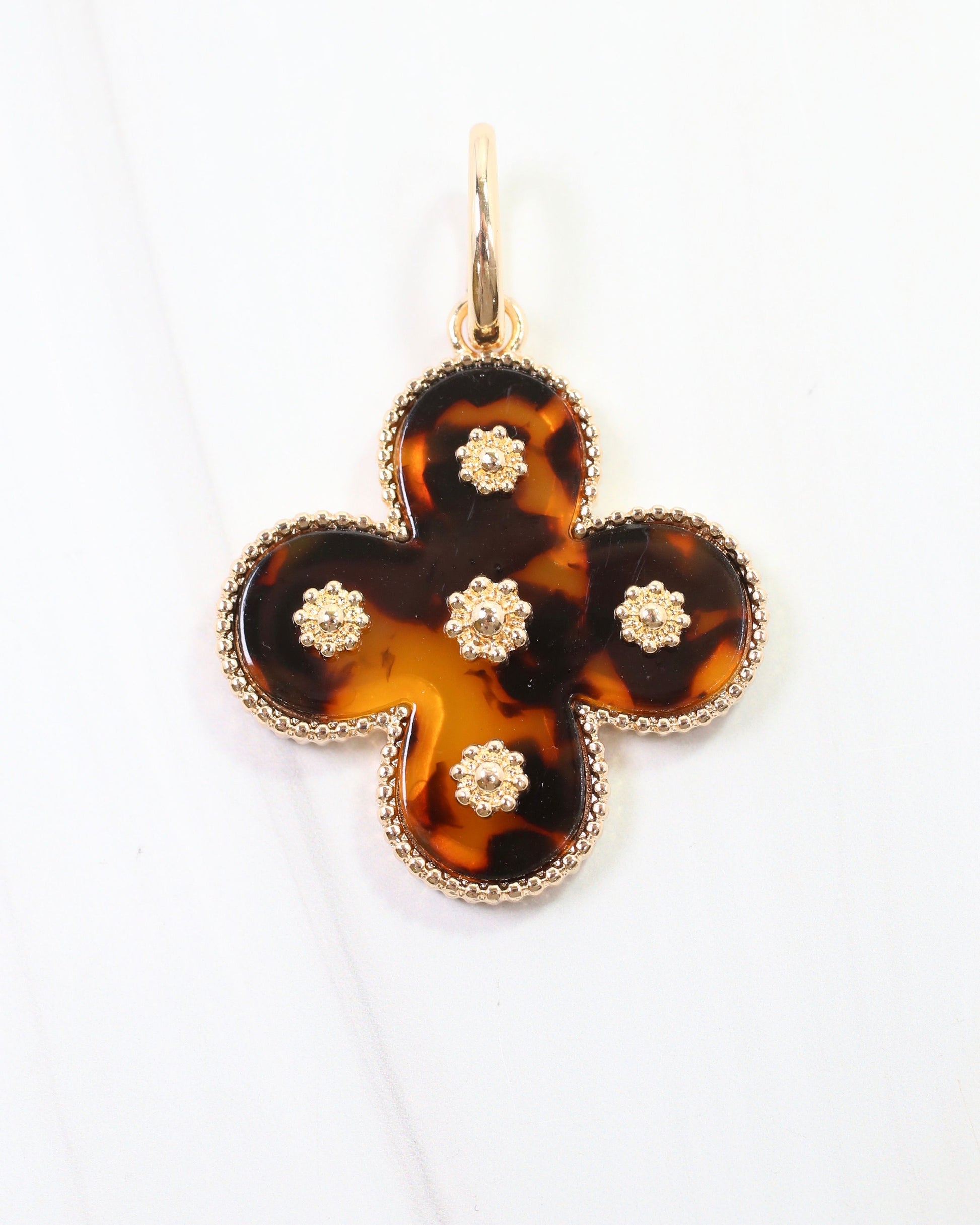 The Joanie Clover Charm Tortoise features a stylish clover shape accented by five delicate gold floral clusters inside, all framed with a sleek gold trim. This fashionable and fun charm adds a unique, elegant touch to your accessories, perfect for brightening up any look.