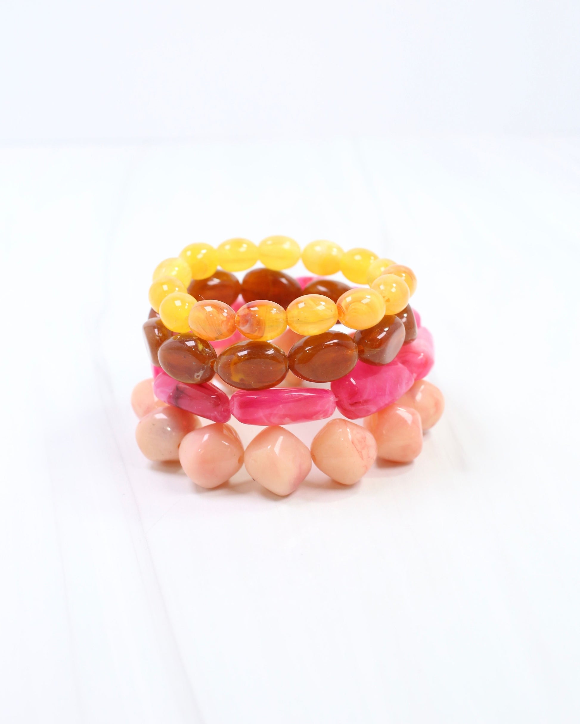 Elevate your wrist style with the Joplin Marble Beaded Bracelet Set in pink. This five-piece collection features stunning marble-effect beads in soft pink tones that add sophistication to any look. Mix and match for personalized styling or stack them together for maximum impact. The comfortable stretch design makes these bracelets perfect for everyday wear and special occasions alike.