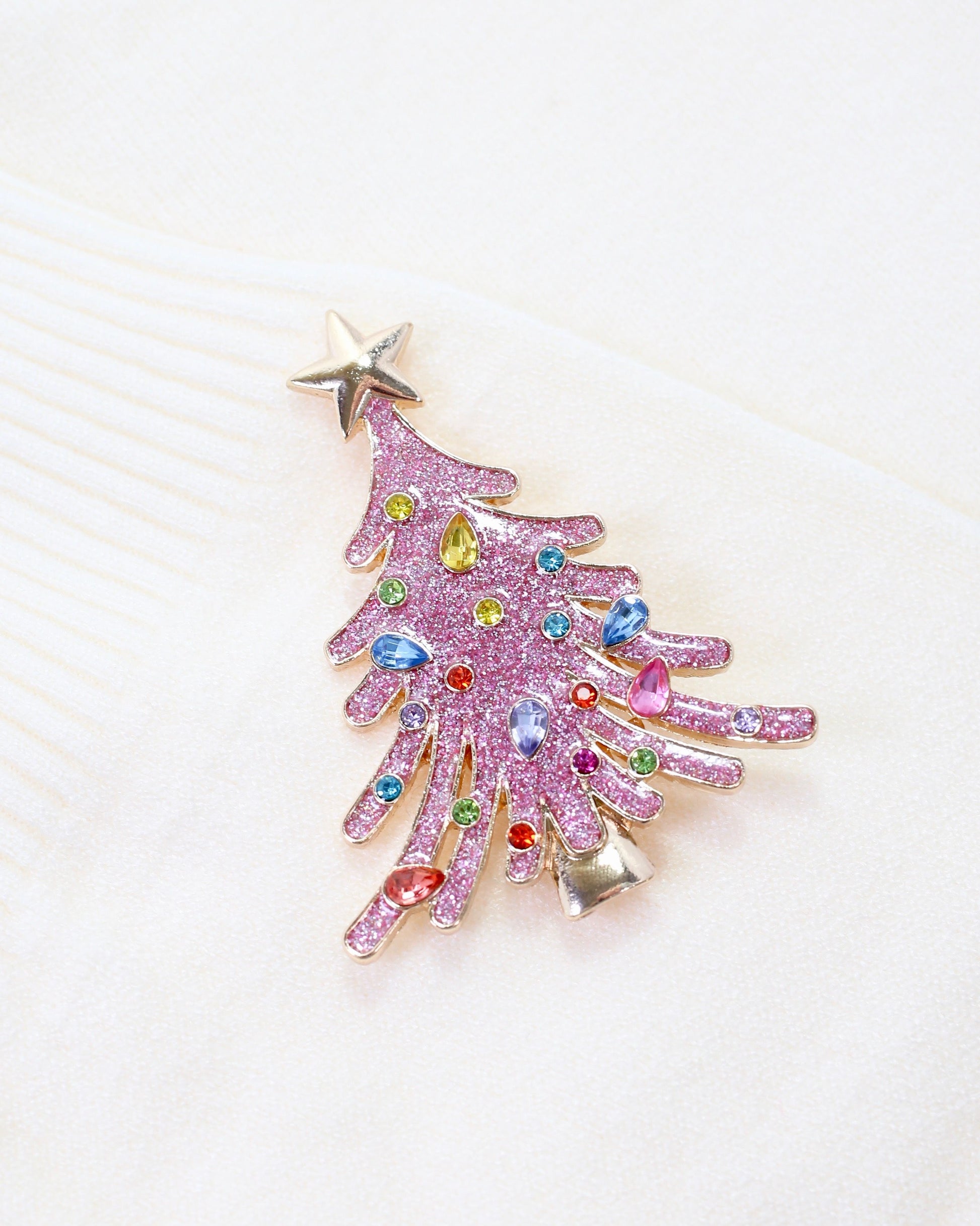 The Joyful Christmas Tree Brooch in Pink features a glittery enamel finish adorned with multicolored, shaped crystal stones. This elegant pin brings a sophisticated sparkle, perfect for adding a fashionable and festive touch to your holiday wardrobe.