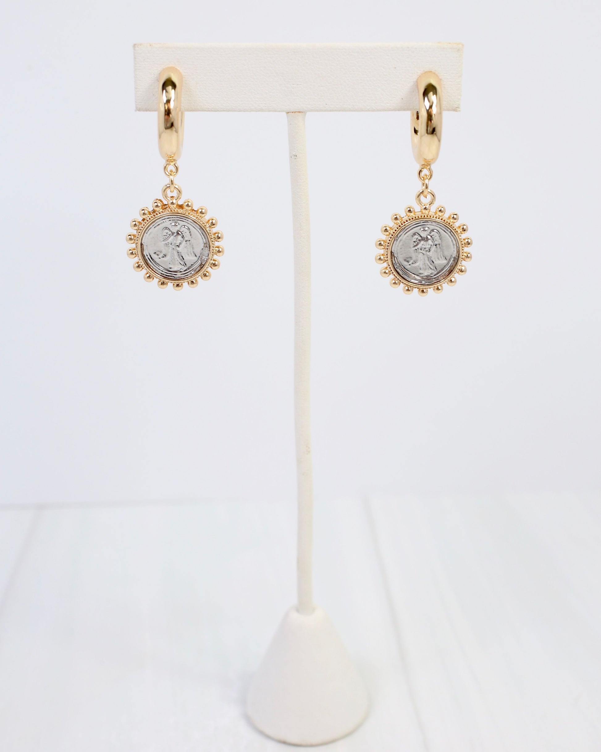 Turn heads with the Kirksville Coin Dangle Hoop Earring in lustrous gold. These statement-making beauties feature delicate coin-shaped pendants that sway gracefully with every move, adding dynamic flair to your look. The perfect blend of bohemian charm and polished elegance, they work beautifully dressed up or down. Lightweight and comfortable, these hoops are your new go-to accessory for instant style elevation.