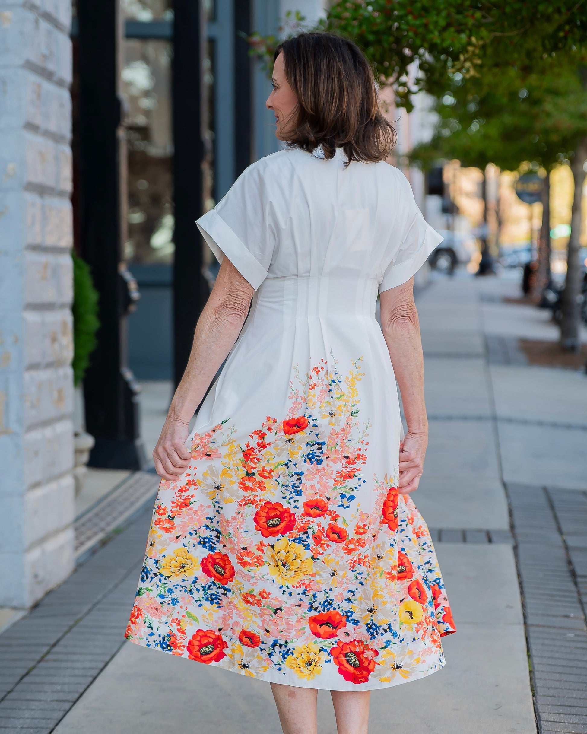 Naomi Floral Short Cuff Sleeve Dress This timeless floral dress combines style with practicality. Structured front pleating creates flattering dimension, while short cuff sleeves offer a polished finish. Button-down styling and convenient side pockets make dressing easy, and the lined construction provides comfort all day long. A versatile wardrobe essential that works for both casual and dressed-up moments.