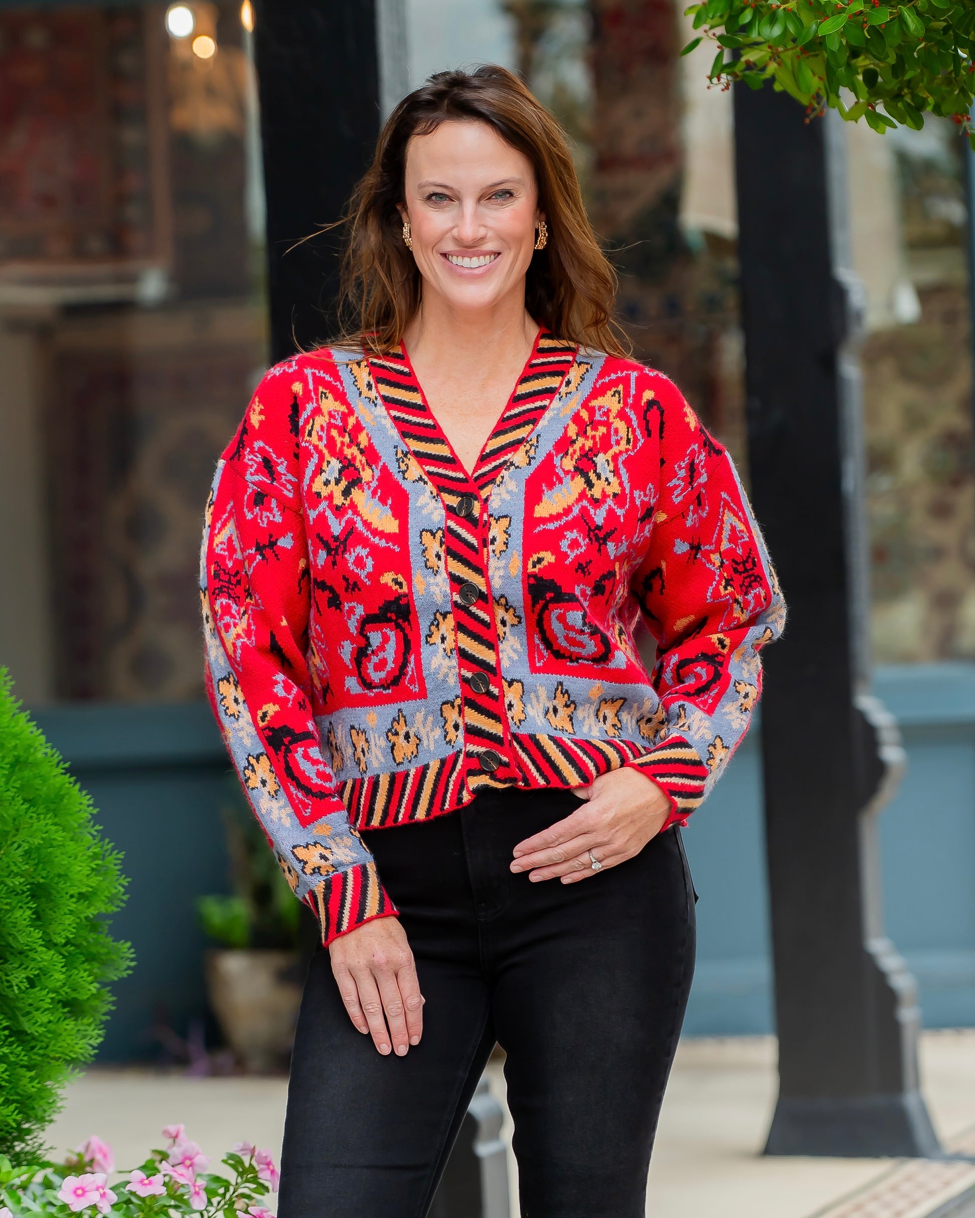 The Lancaster Paisley Knit Cardigan in Red Multi showcases a sophisticated design with a V-neck and button-down placket. Its semi-cropped, boxy fit features drop shoulder long sleeves for a relaxed yet polished look. The detailed paisley and floral border knit pattern is complemented by contrast striped accents on the neckline, cuffs, and hem, adding refined visual interest to this elegant layering piece.