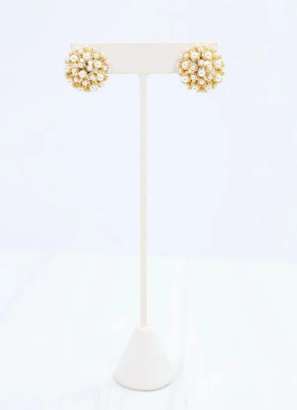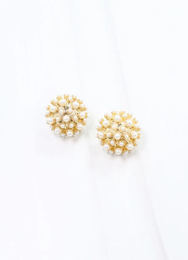 This gold stud earring has a sunburst style design with accent pearls for a classic silhouette.