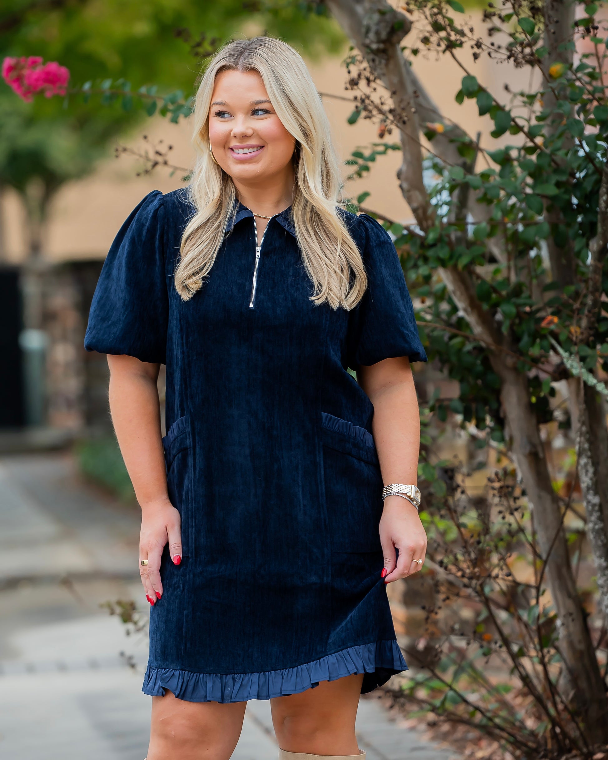 The Lehi Quarter Zip Dress blends playful charm with easy style. Featuring a silver zipper that adds a modern edge, this dress delights with ruffle details on the collar and bottom trim, giving it a flirty finish. Front pockets with subtle ruffles offer both function and a cute accent, perfect for a day of casual fun or stylish comfort on the go.