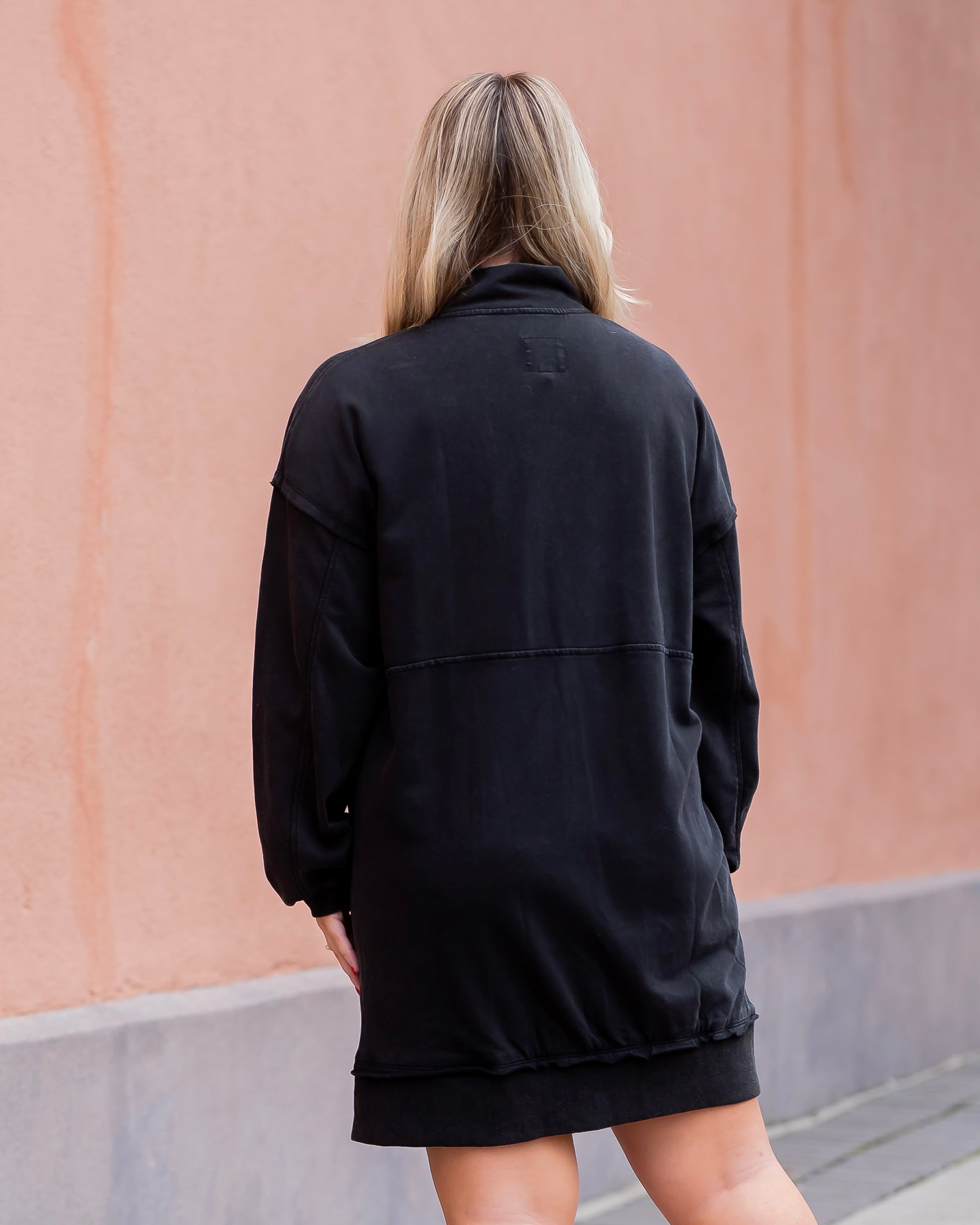 This Leigh Leopard Bow Sweatshirt Dress in black combines comfort and style with its mineral wash French terry fabric. Featuring a high neck and a chic contrast ribbon, it adds a fashionable edge to casual wear. The ribbed step hem with raw edge details and side slits enhances movement and modern appeal. Perfect for effortless, trendy looks without compromising on comfort.