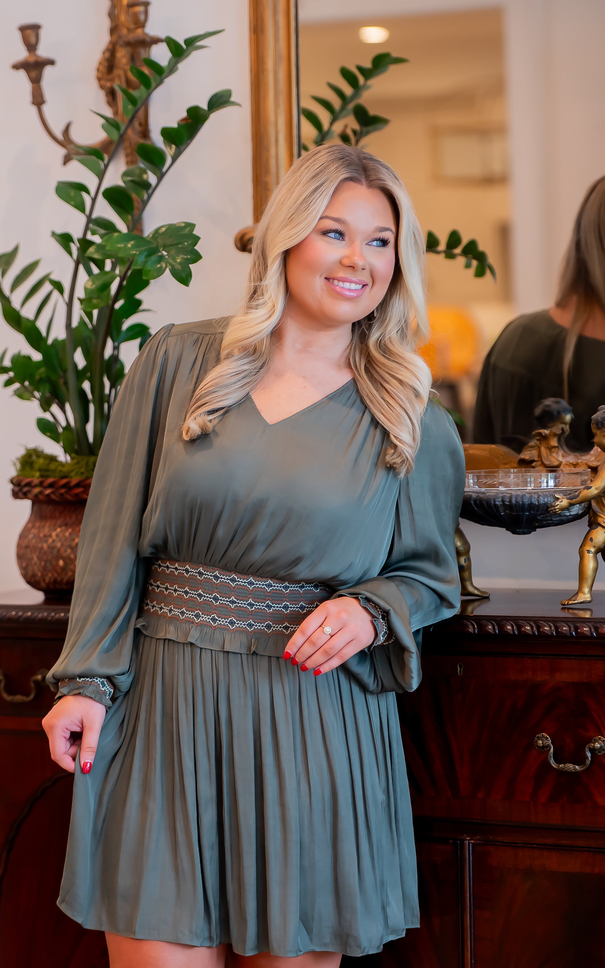 Elevate your wardrobe with the Leslie Smocked Dress, crafted in an elegant olive green fabric that mimics the softness of silk. Its delicate pleating adds graceful movement, while the exquisite smocking at the waist and cuffs defines a flattering silhouette. The sophisticated V-neckline completes this timeless piece, perfect for making a refined statement at any event.