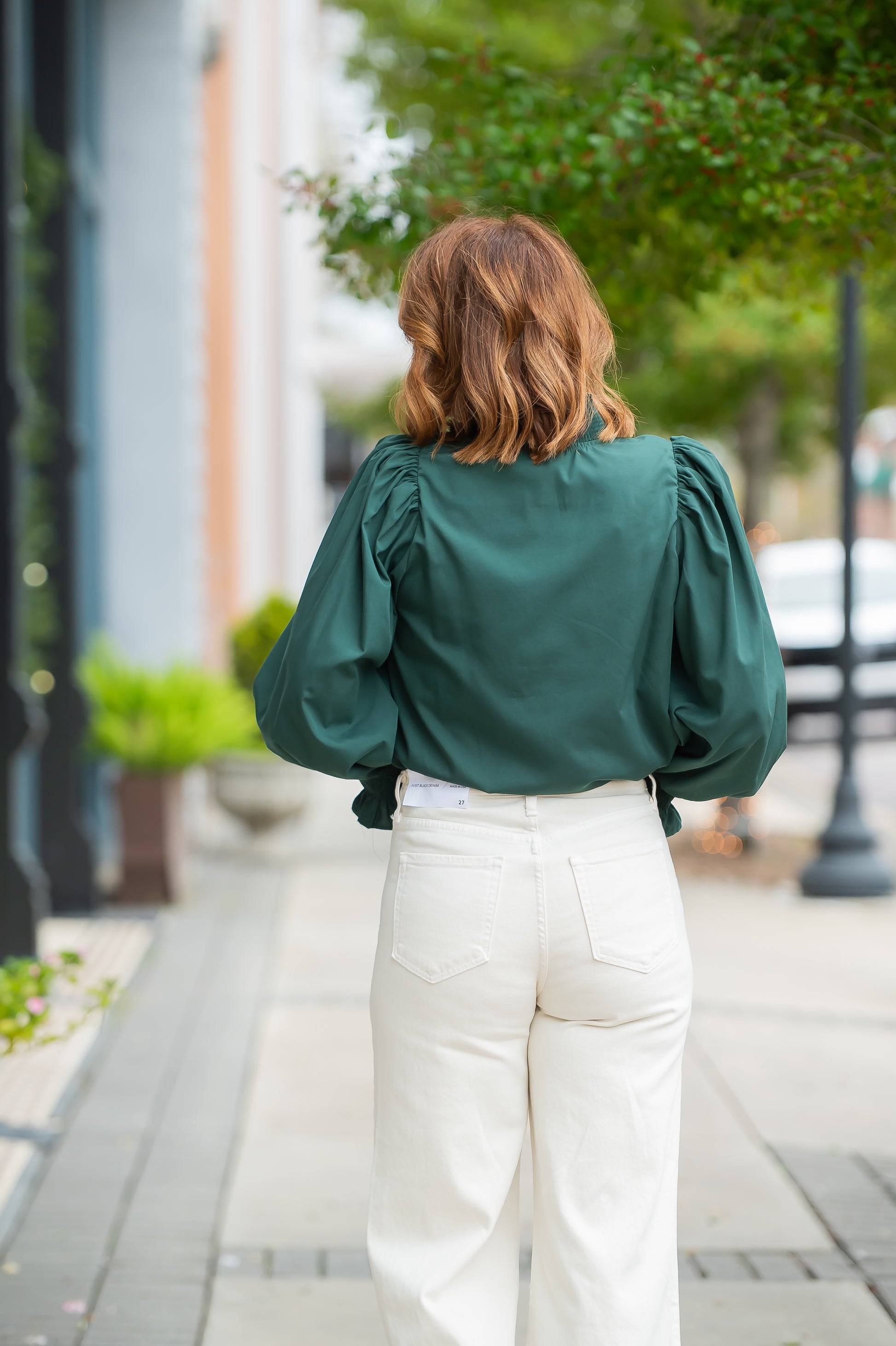 Elevate your wardrobe with the Libby Leopard Trimmed top in Hunter Green. This lightweight woven long-sleeve top features playful animal print accents along the front placket and neckline, adding a stylish edge to your look. The ruffled mock neck and smocked cuffs bring a fun, fashionable flair, while the non-sheer fabric ensures comfortable, confident wear all day.
