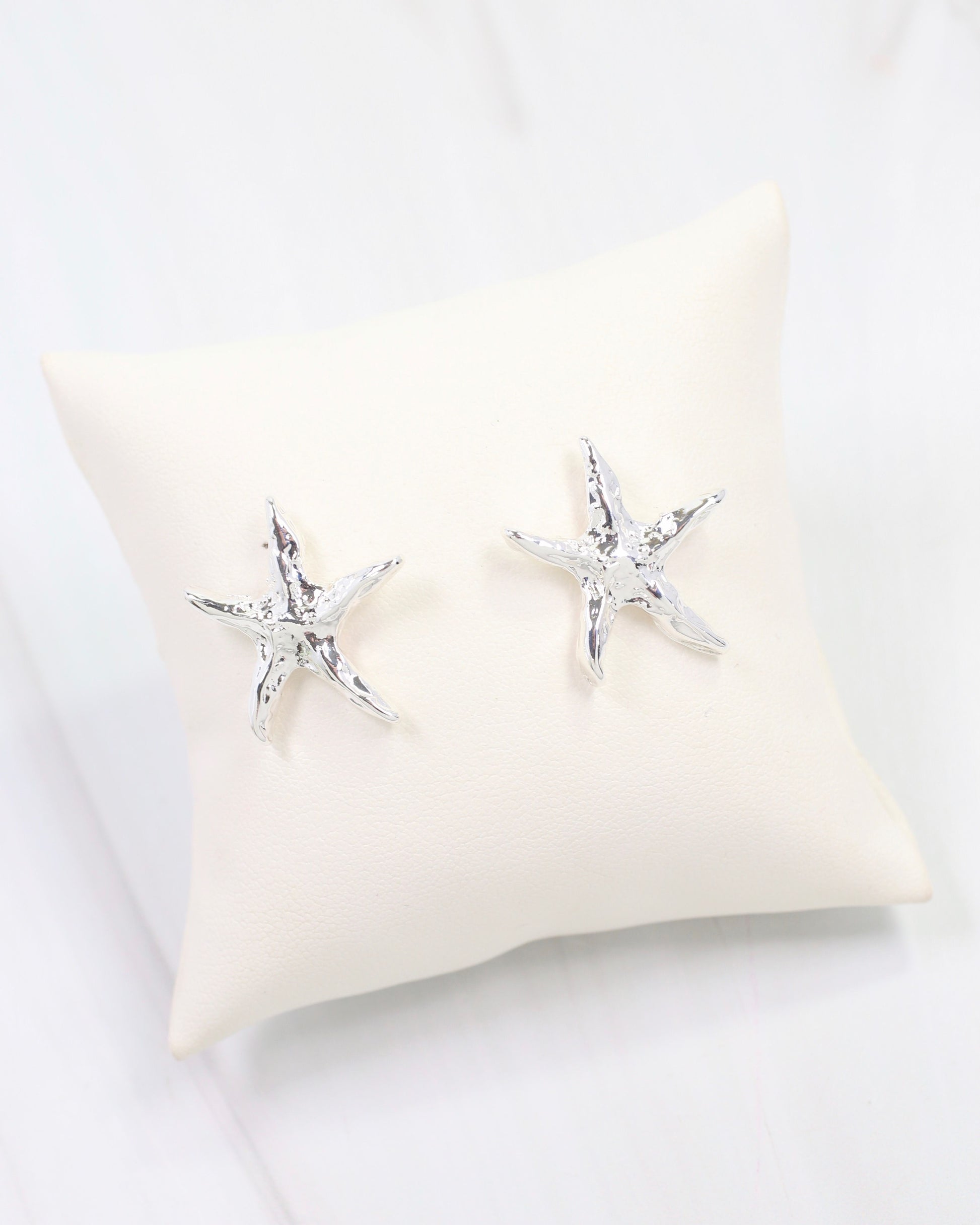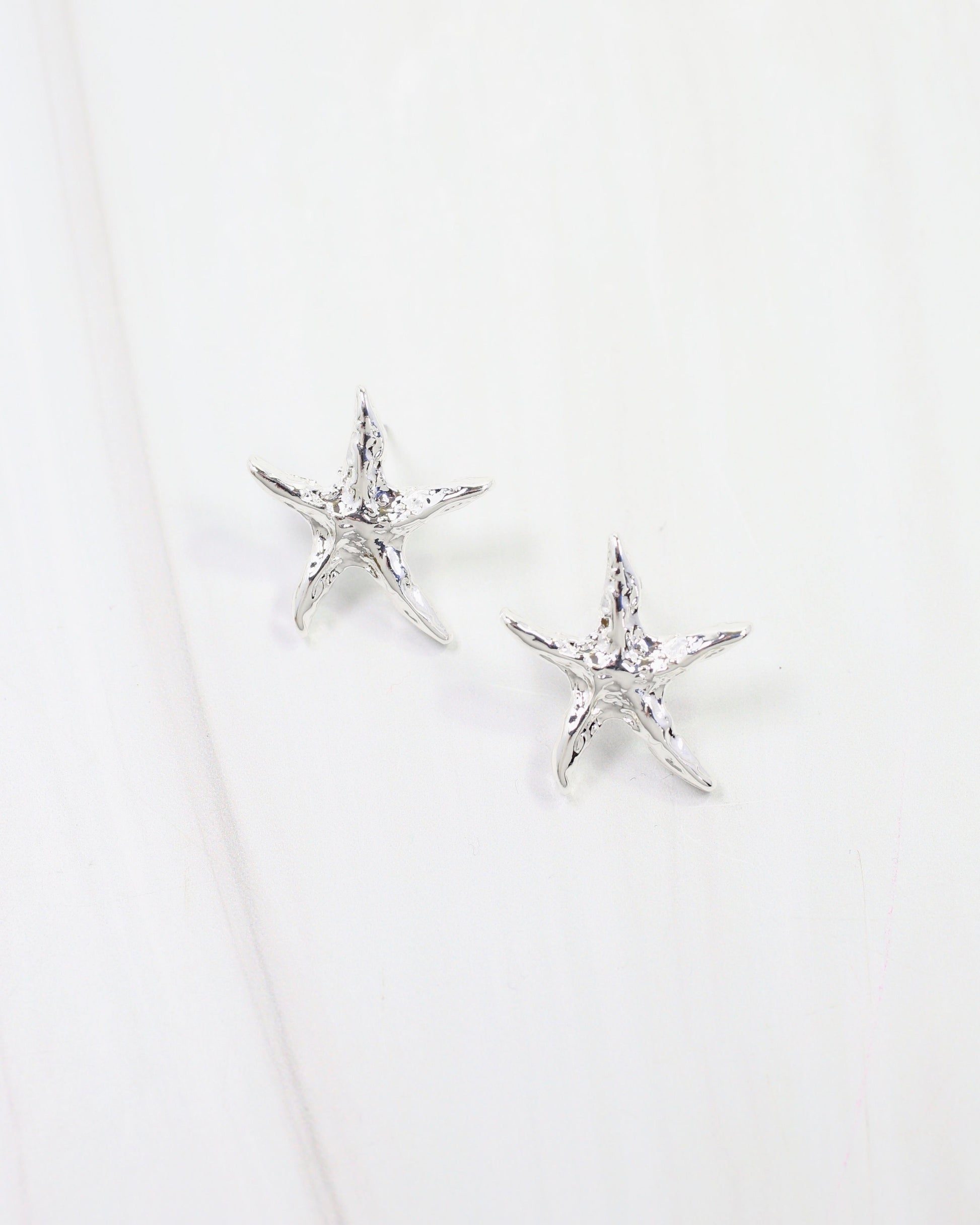 The Lima Hammered Starfish Earrings in silver feature artisanal hammered detailing on a charming starfish silhouette. Versatile and playful, they bring coastal-inspired elegance to any look.
