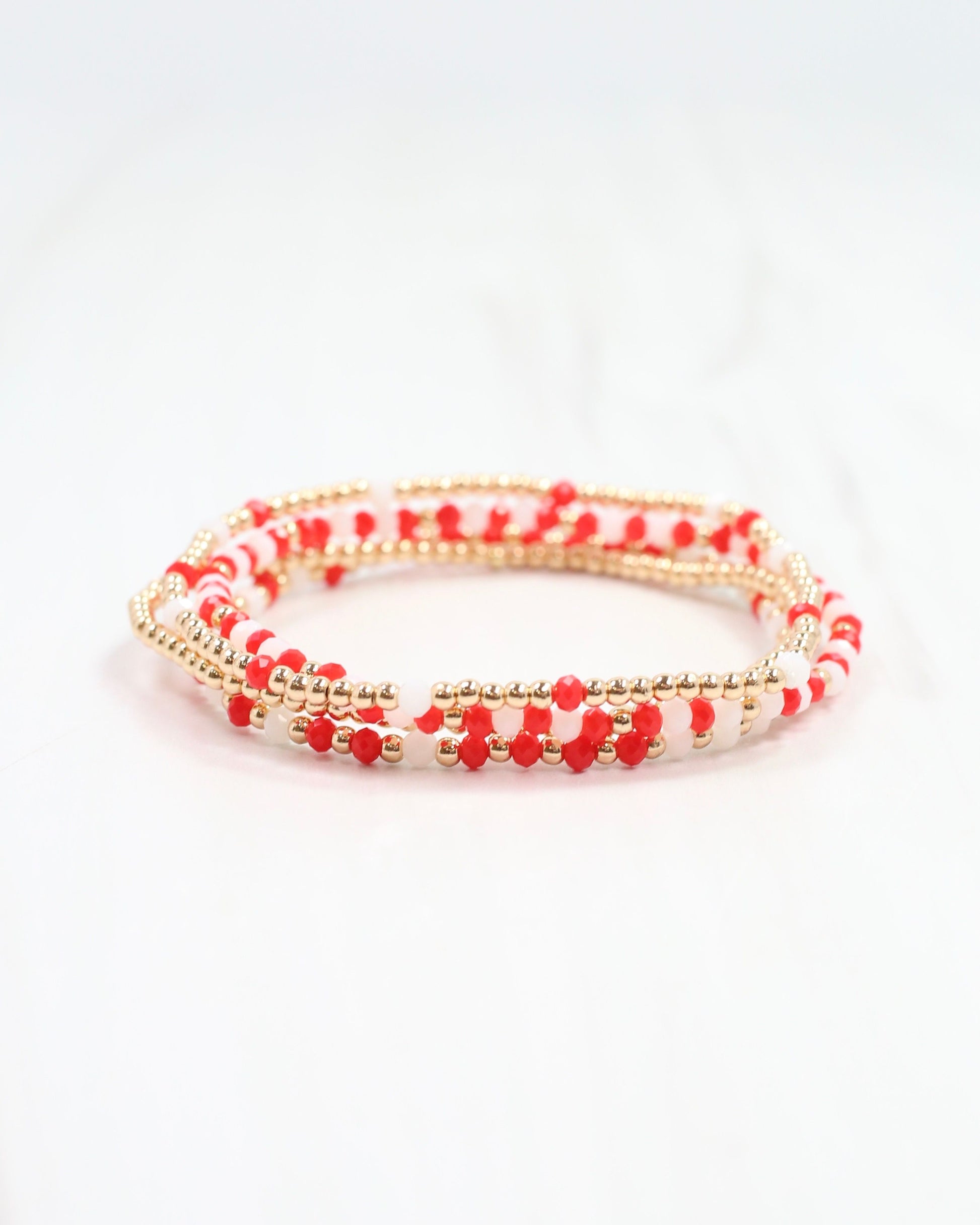 Add a pop of sparkle and team spirit with the Lottie Beaded Bracelet set in Red and White! Featuring four stretchy strands adorned with gold and colorful glass beads, these bracelets are perfect for stacking and mixing with your favorite accessories. Comfortable and flexible, they fit most wrists with ease.