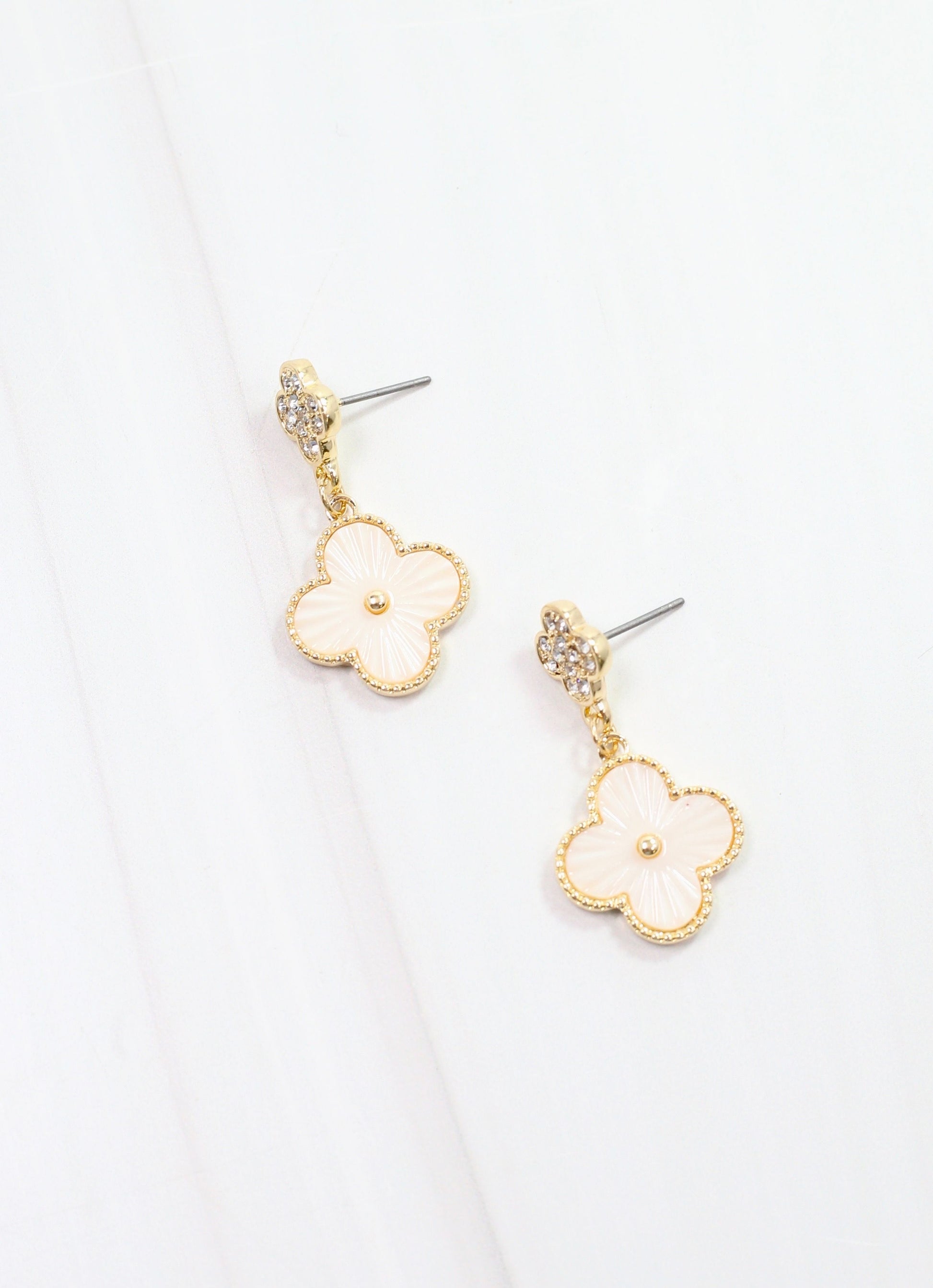 This classic earring features a CZ filled clover post with a mother of pearl clover drop accent.