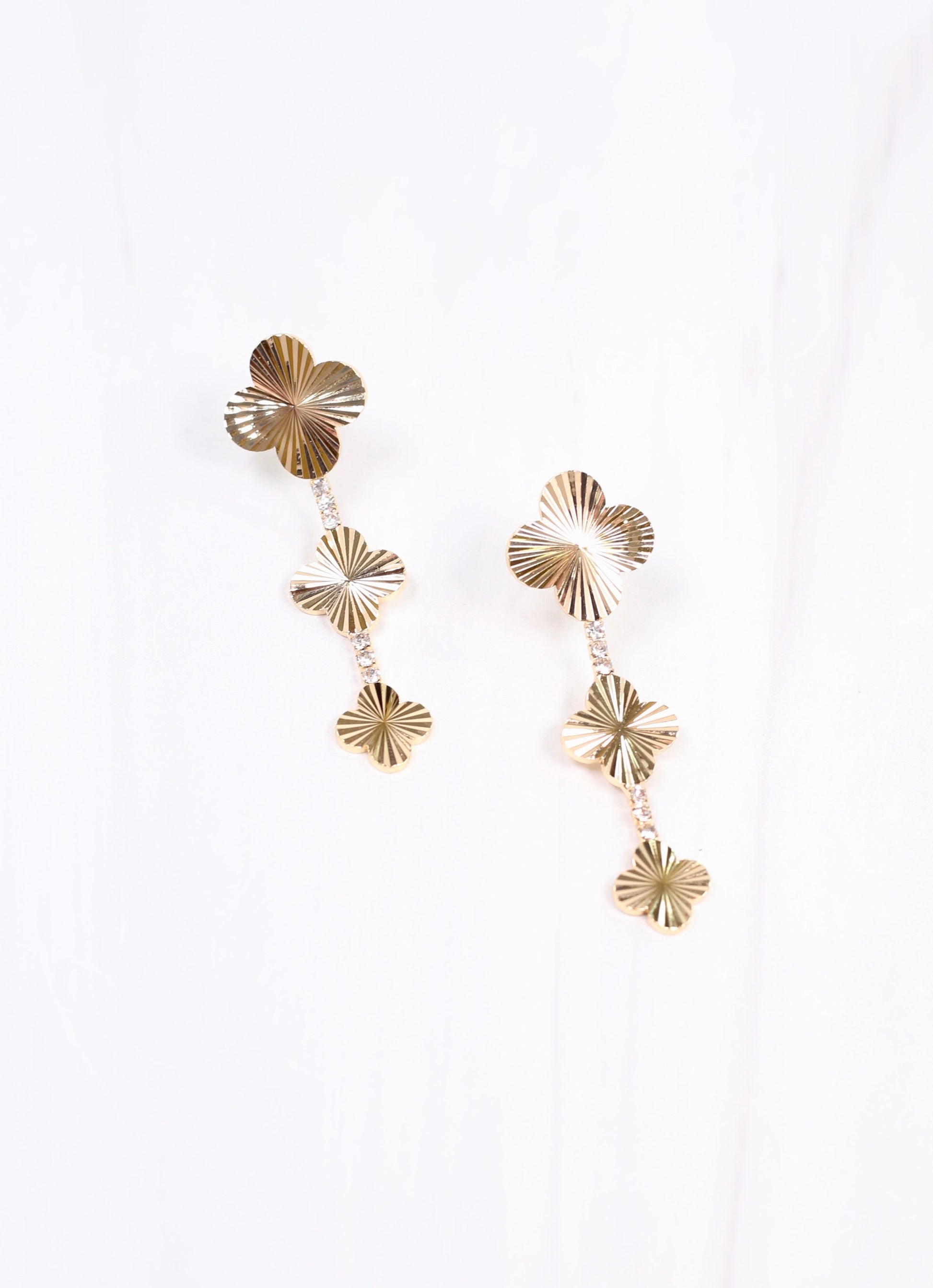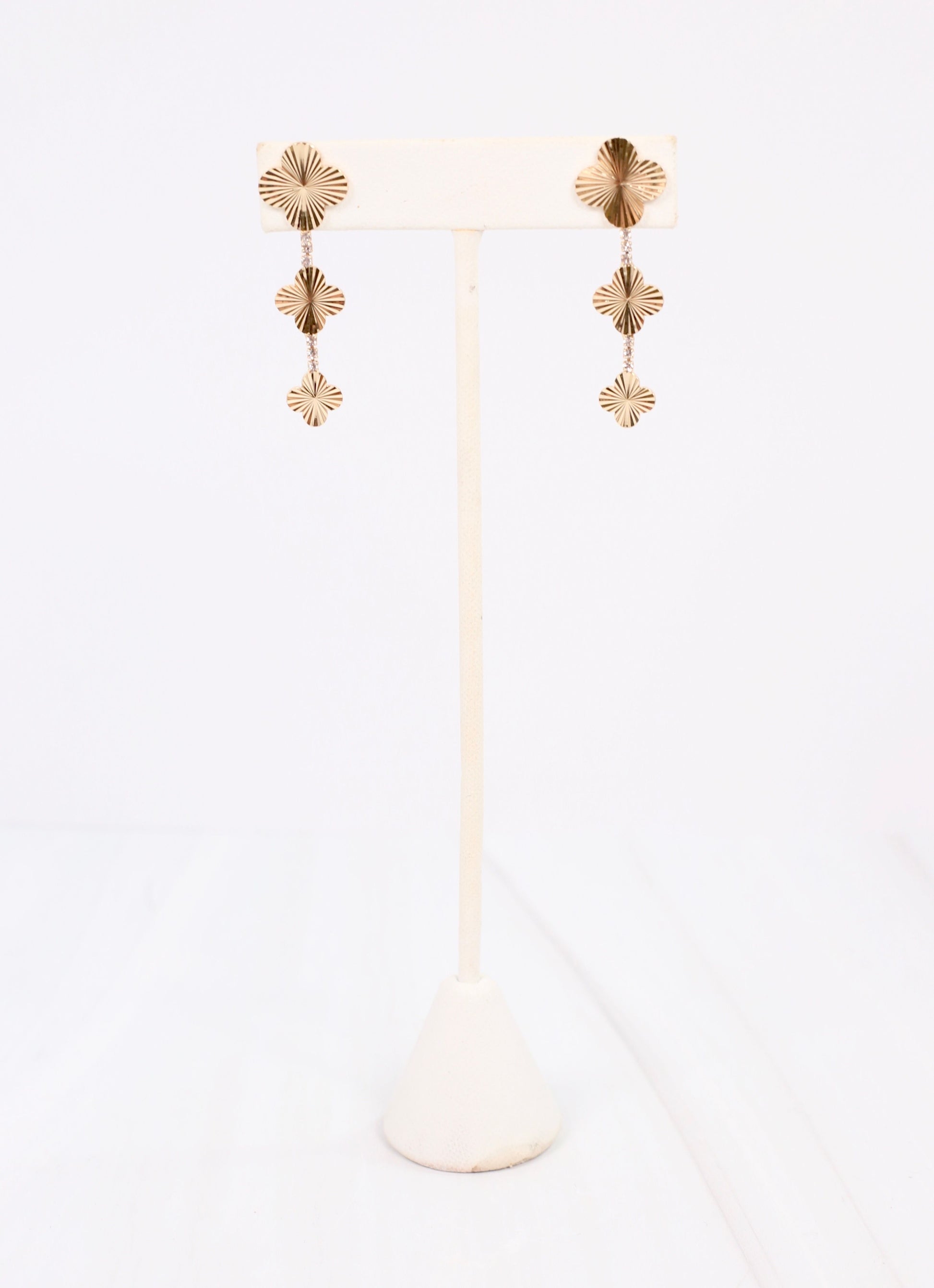 This triple drop clover earring is gorgeous. Each clover has a ribbed metal design, and they are connected with subtle CZ accents. Made with brass.