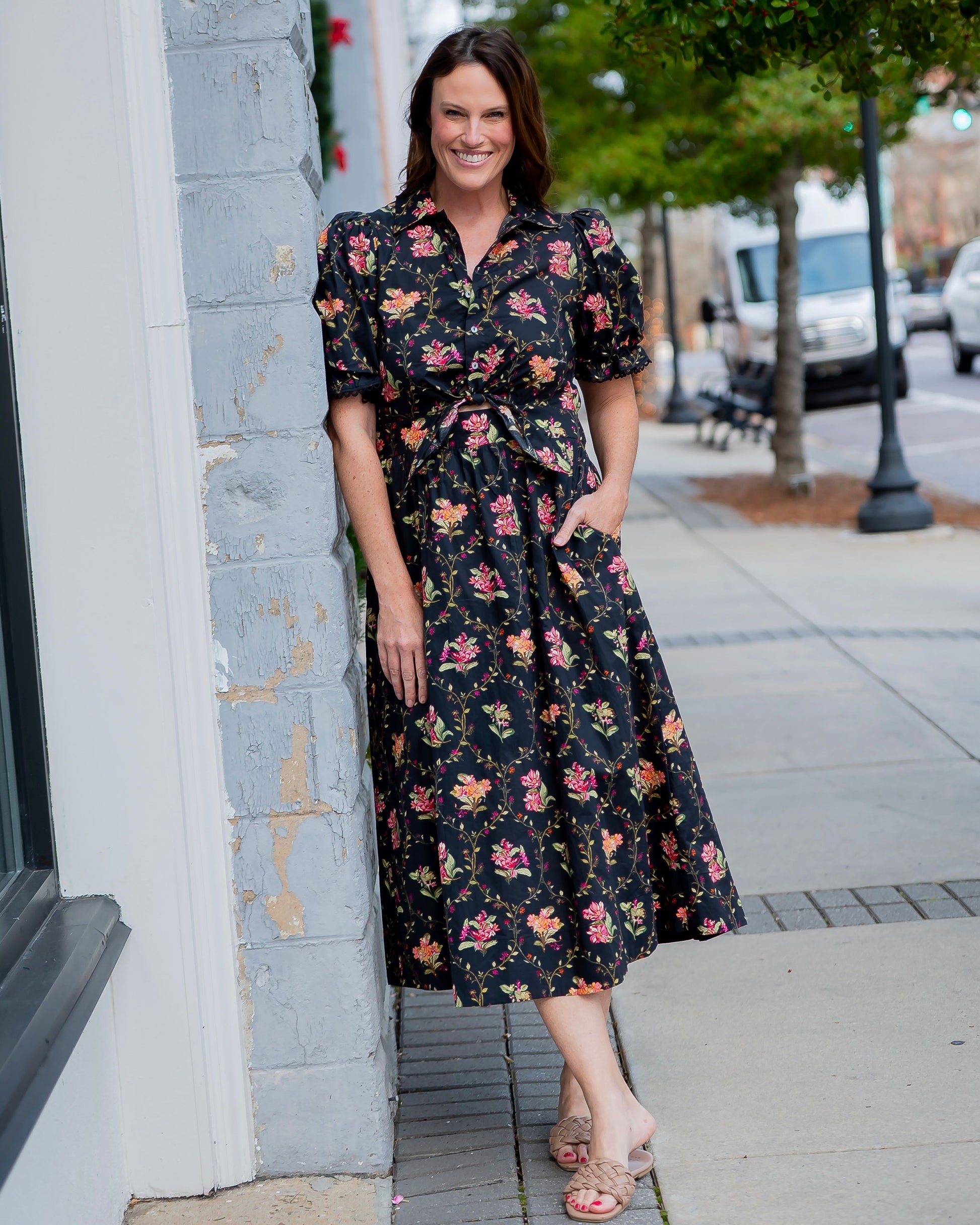 This elegant Gretchen Floral Print Dress combines a lively black base with delicate pink and green botanical patterns for a bright, beautiful look. Crafted with short puff sleeves adorned with scallop trim, it features a ruffled neckline and a partial button front for subtle charm. The self-tie waist enhances your silhouette, making this midi dress a sophisticated choice for any occasion.