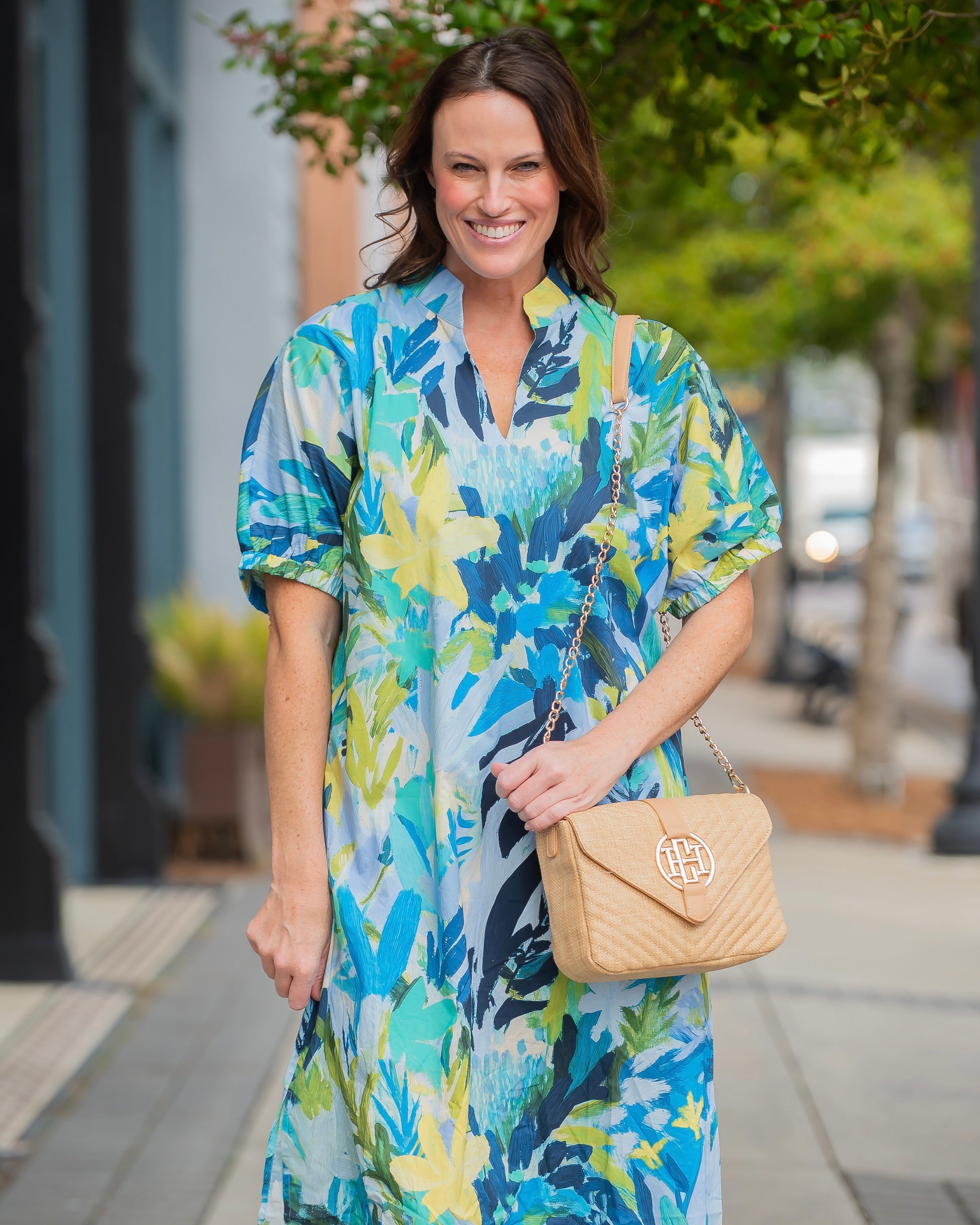 Effortless elegance meets tropical vibes in this lightweight midi dress. Crafted from woven fabric with a flattering band collar V-neck and dolman sleeves, it features practical side pockets and subtle side slits for easy movement. The palm leaf print adds a fresh, botanical touch while the lined construction ensures a polished, non-sheer silhouette. Perfect for warm-weather dressing with understated sophistication.