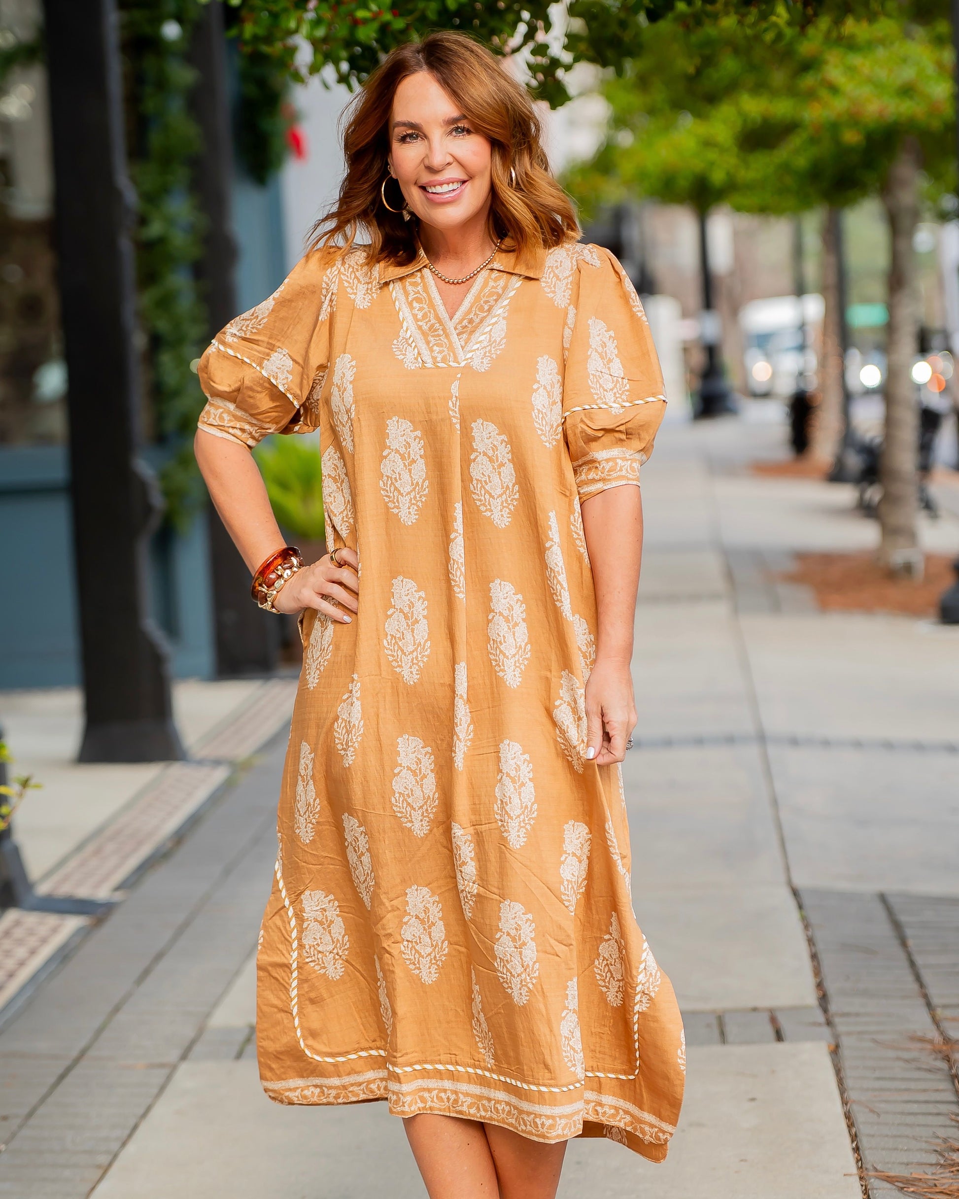 Embrace effortless elegance with this Rain Botanical Print V-Neck Dress. Featuring a striking botanic crest border print, the split neckline adds a modern edge while side slits enhance movement and comfort. The relaxed, flowy silhouette drapes beautifully for an understated yet chic look that transitions seamlessly from day to night. Unlined for breathable wear. Perfect for those who love nature-inspired style with a laid-back vibe.