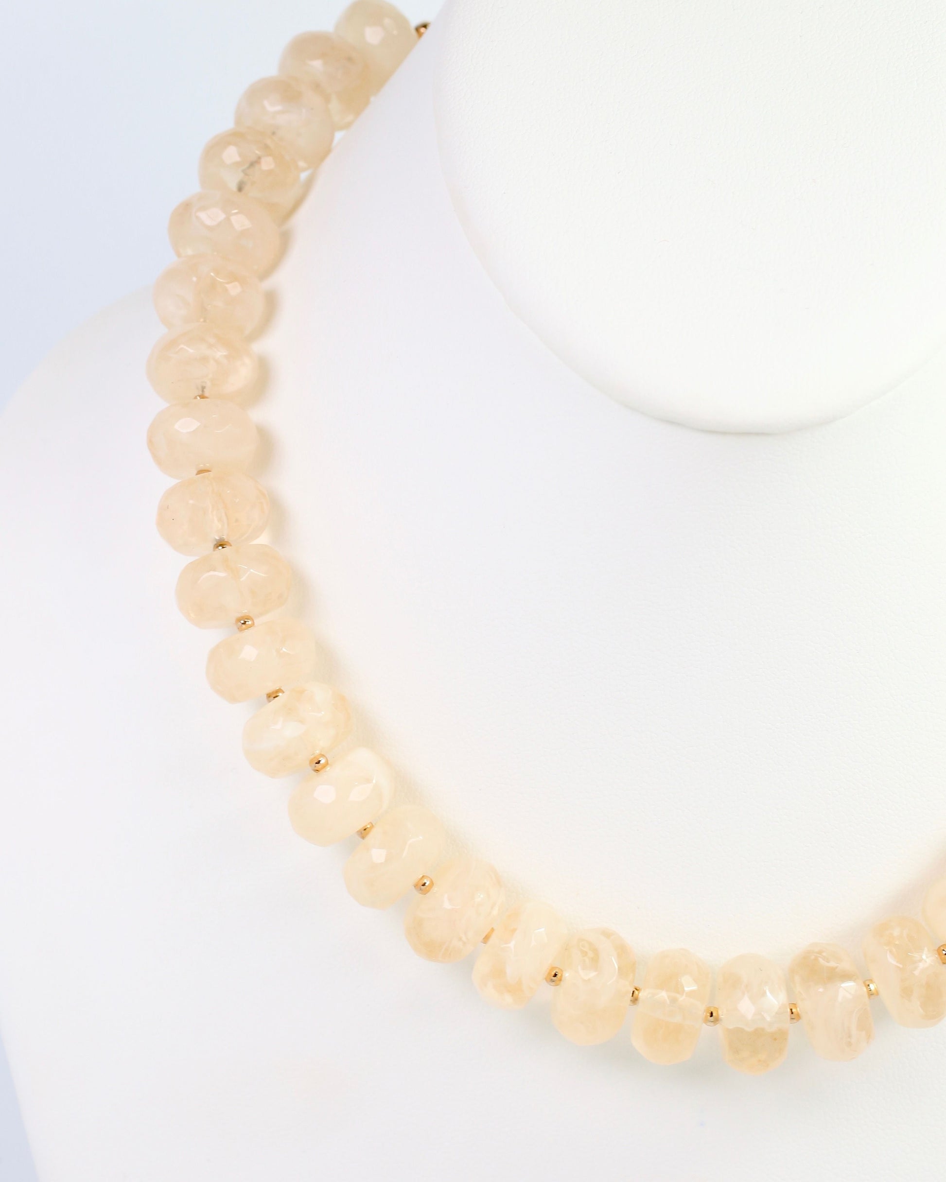 The Mansfield Beaded Necklace in Ivory showcases beautiful faceted beads accented with petite gold spacer beads for a striking contrast. This statement necklace adds a fashionable and fun touch to any outfit, perfect for making your look stand out.