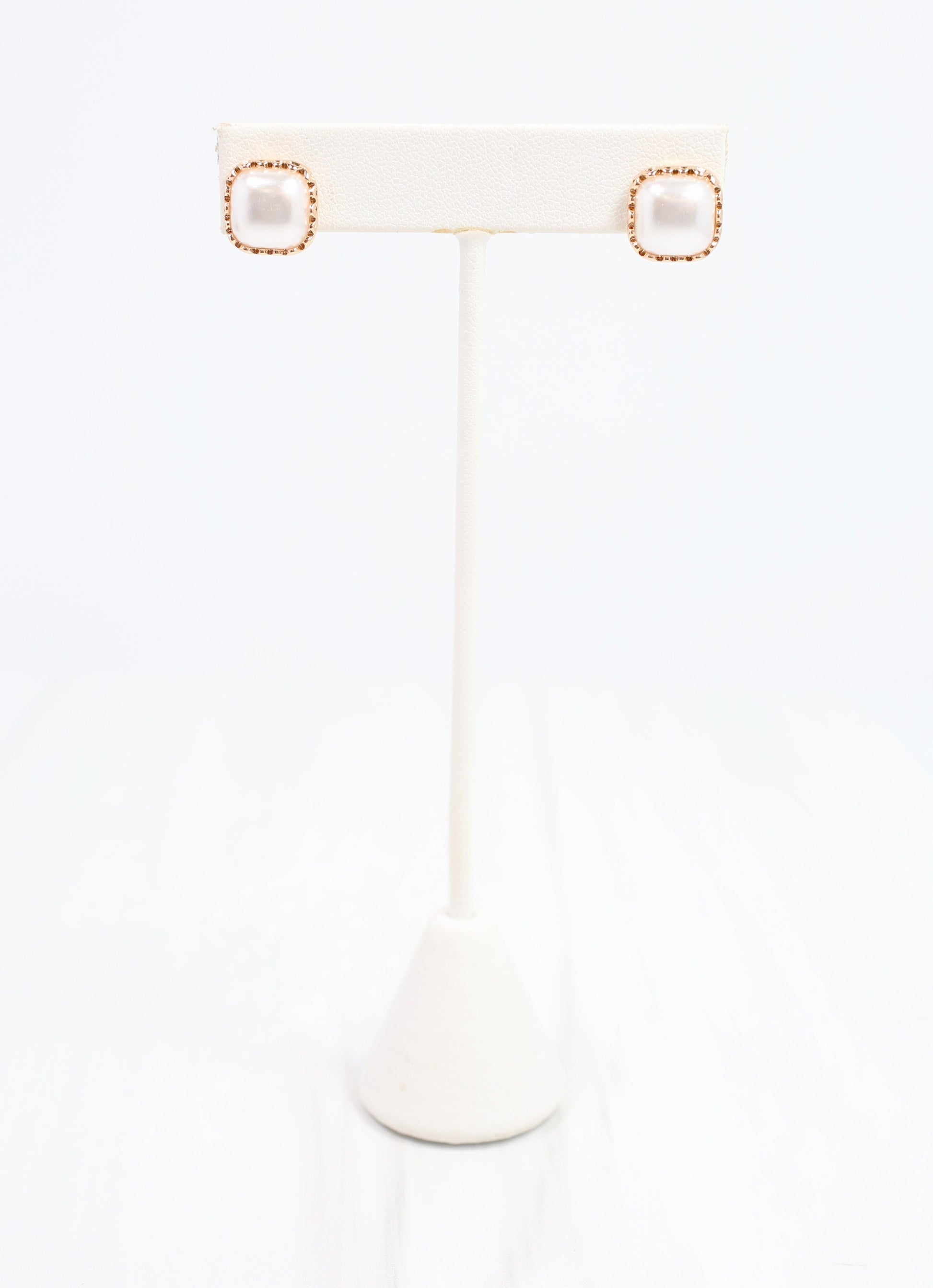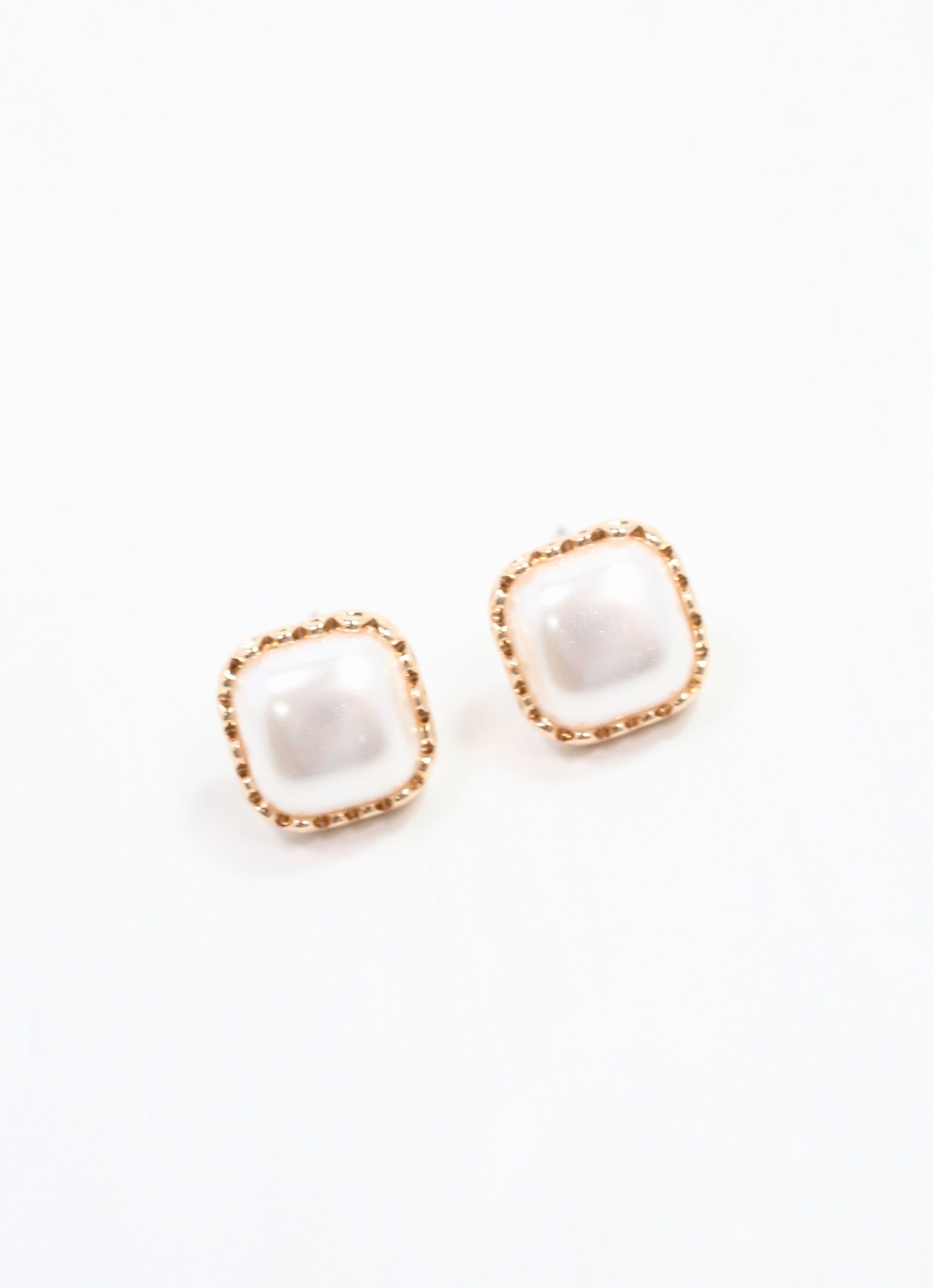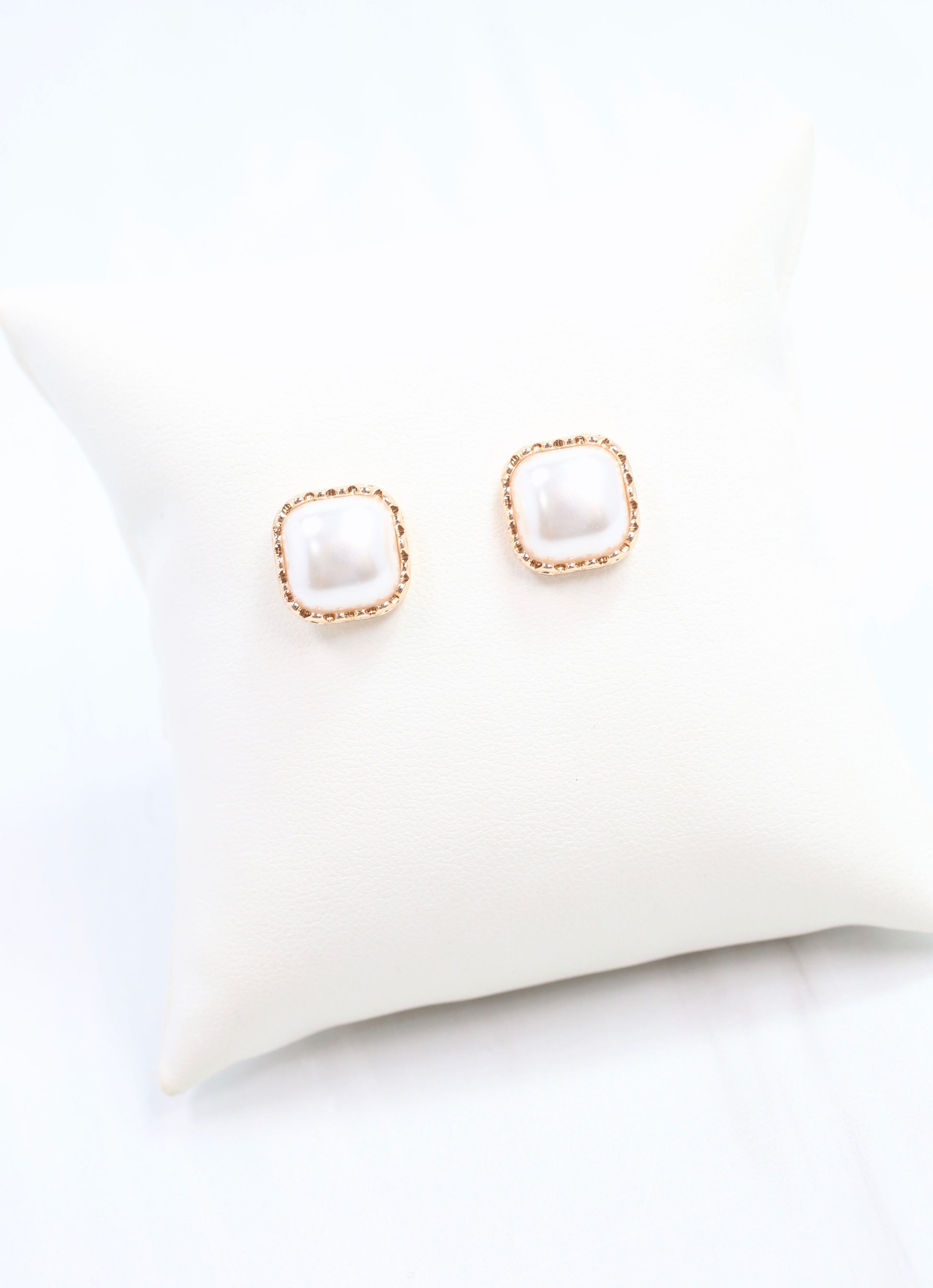 This basic pearl stud is an essential accessory to have. It has a puffed square design in a gold setting.