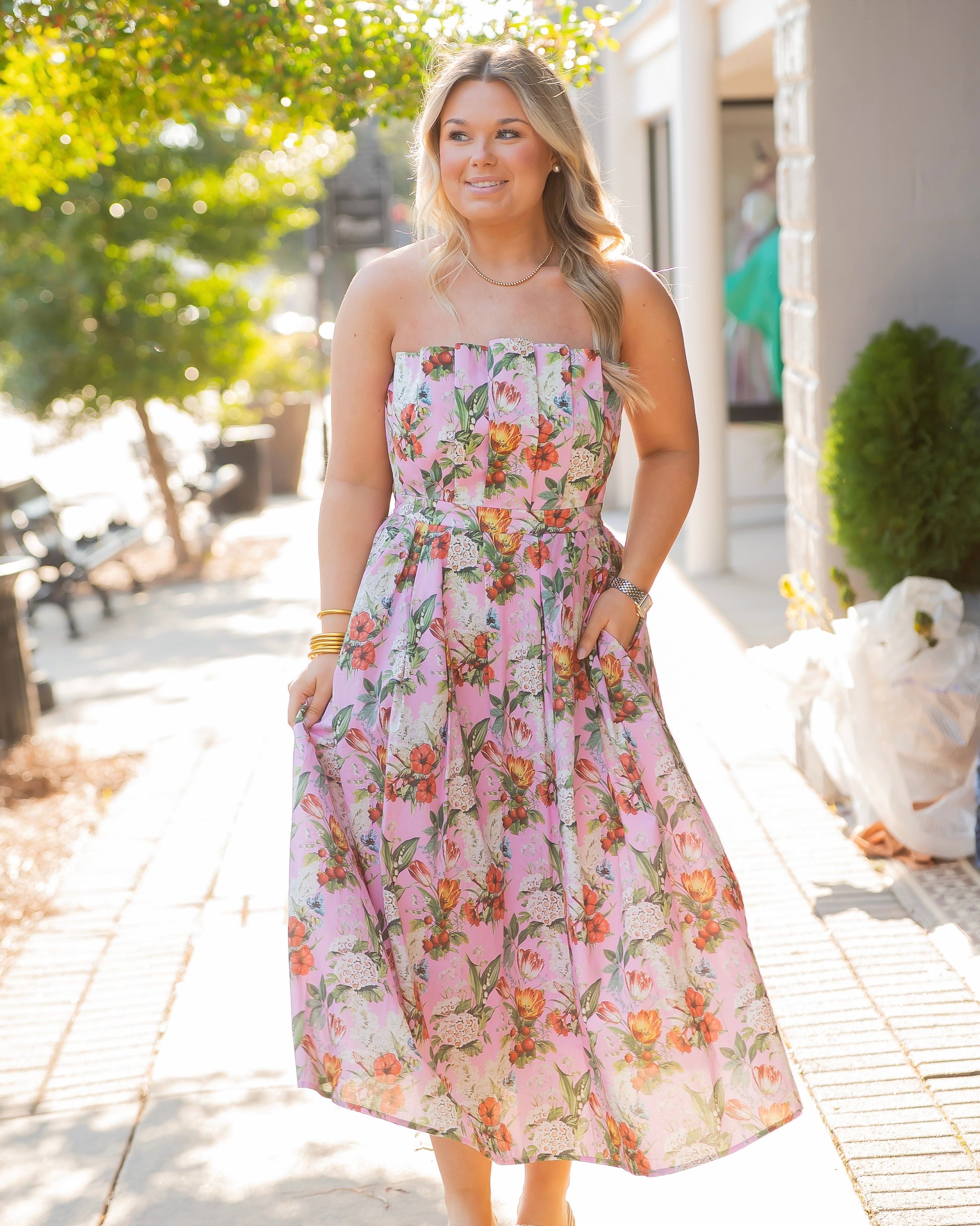Elegant strapless design meets practical sophistication in this floral dress. The smocked back and zippered closure provide a flattering silhouette, while fan pleated detailing at the front chest adds visual interest and dimension. Side pockets offer everyday functionality without compromising style. Fully lined for comfort and confidence. A versatile piece perfect for garden parties, weddings, or elevated casual occasions.
