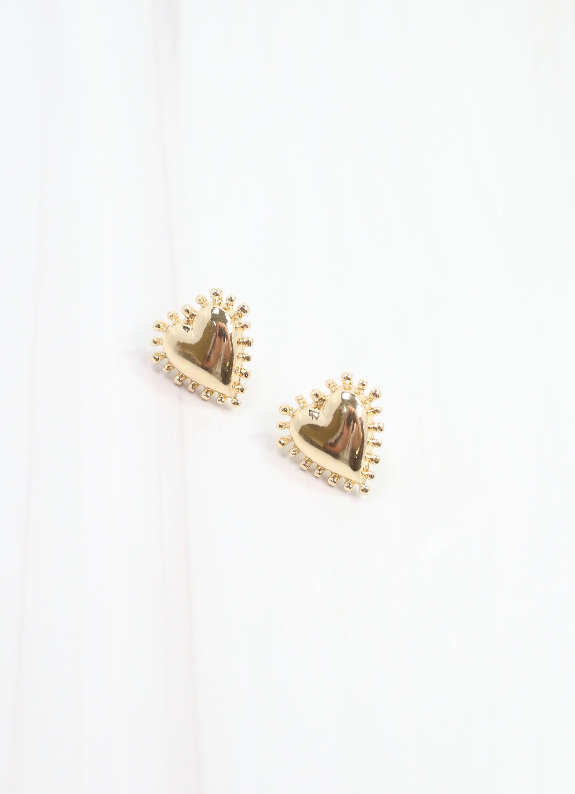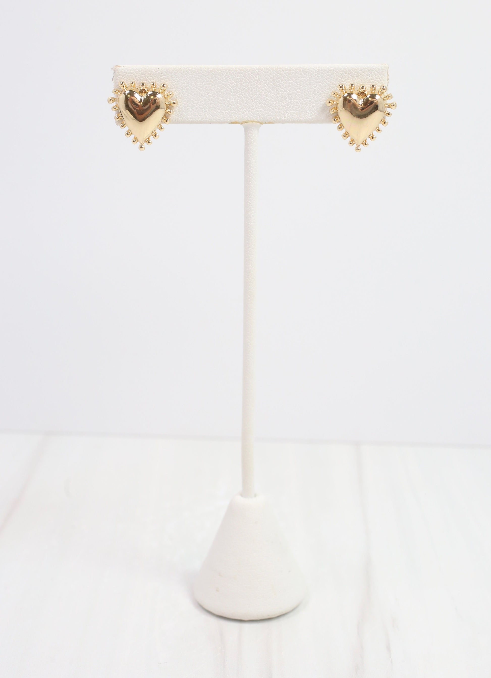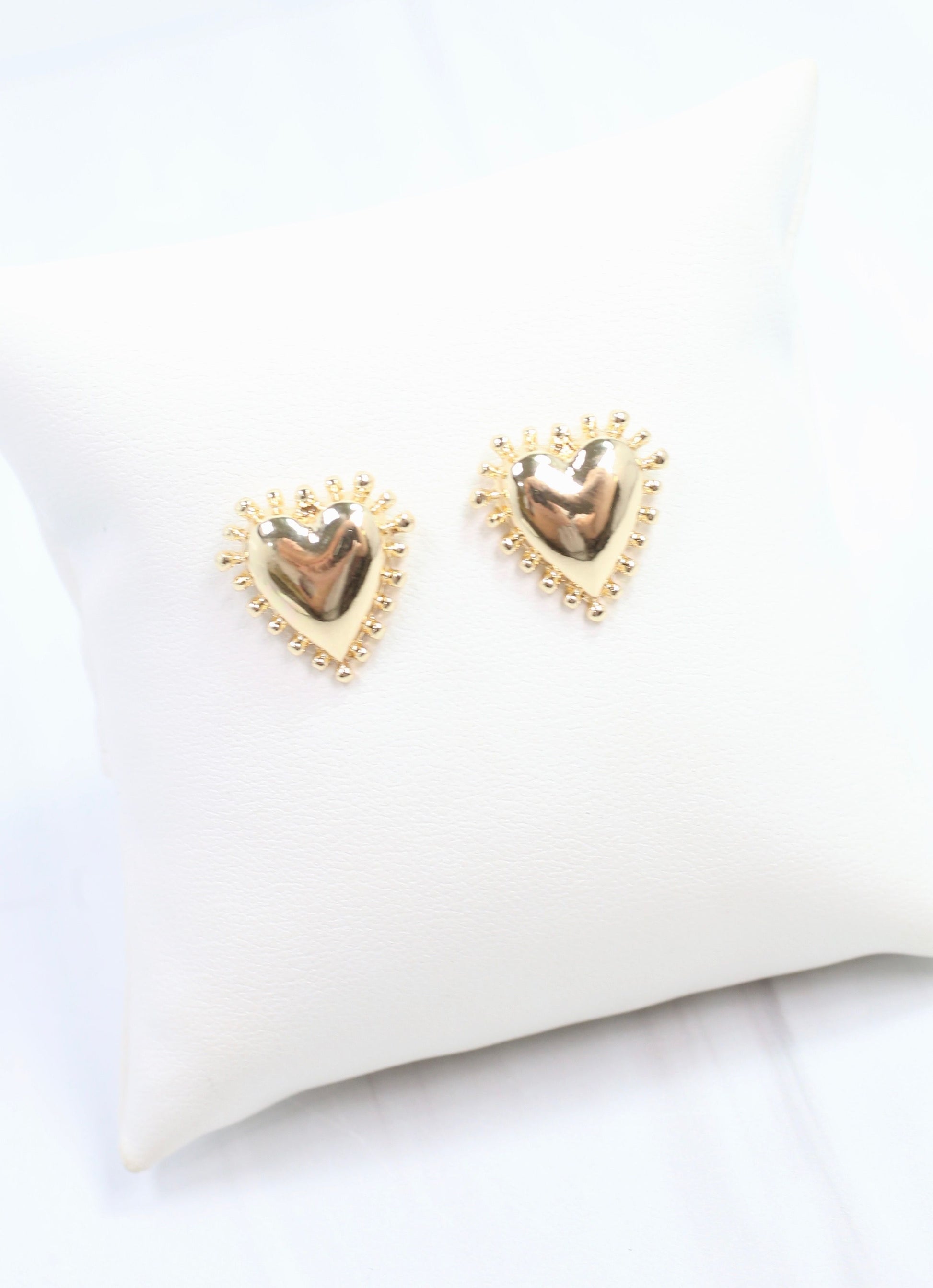 This shiny metal heart stud earring has a dotted accent border for a sweet little added detail.