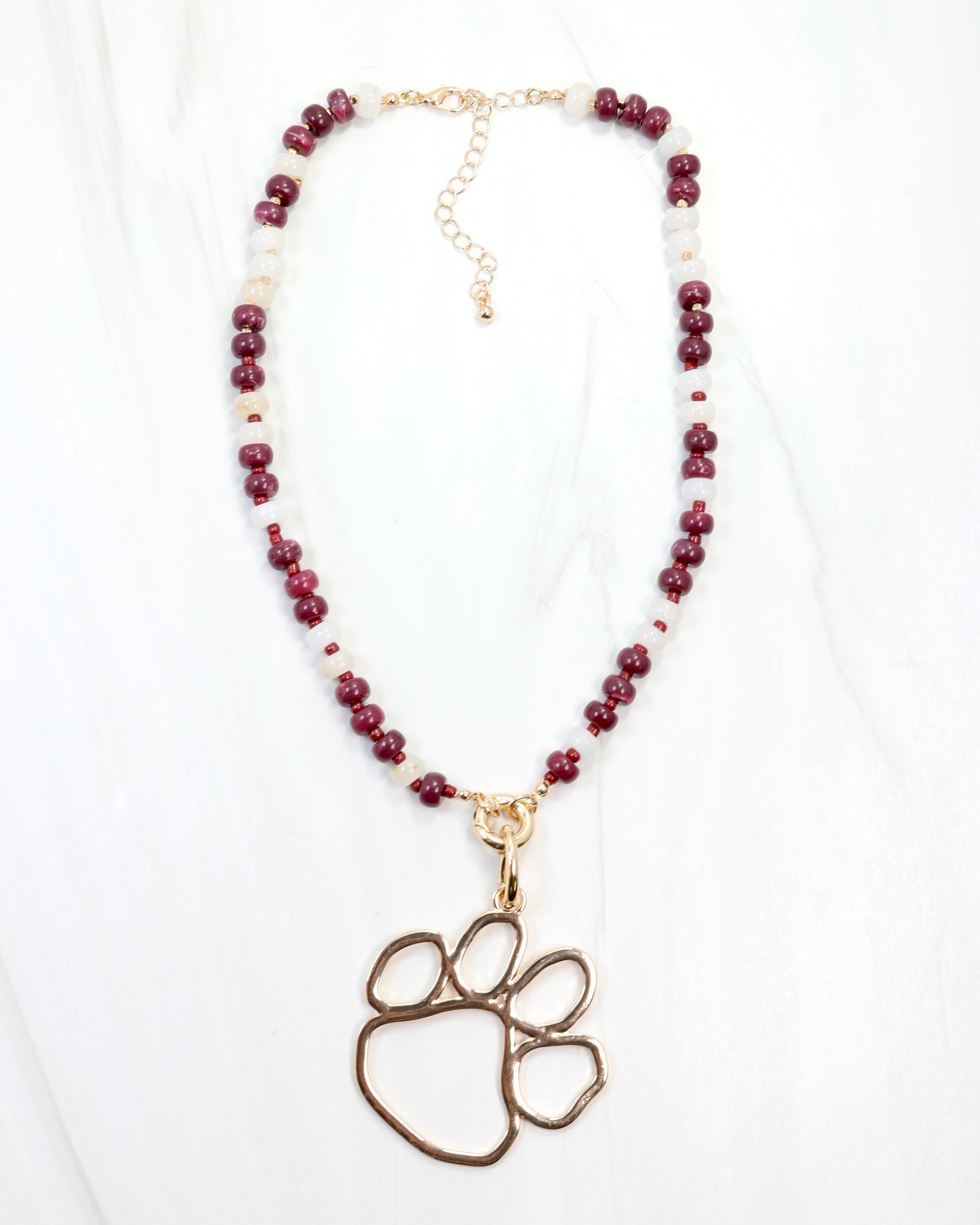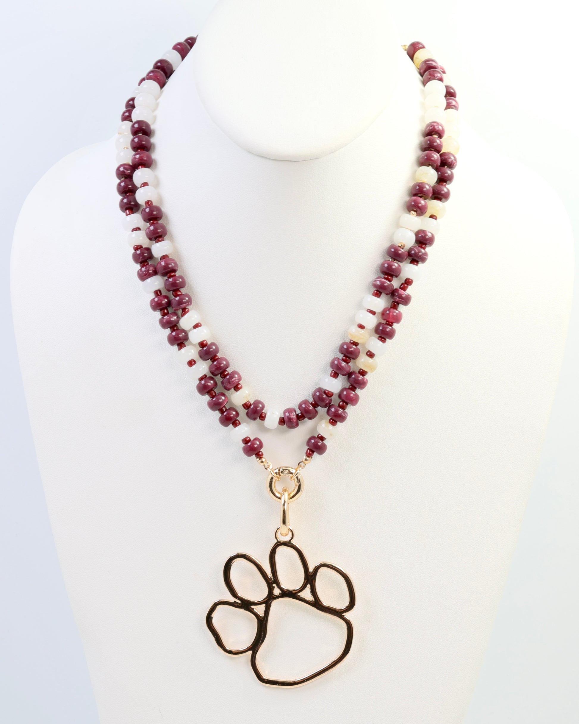 Show your team pride in style with the McLane Stone Necklace featuring bold maroon and white stones. This fashionable piece includes a convenient toggle clasp, allowing you to easily add your favorite charm for a personalized touch. Perfect for game day or everyday wear, it combines spirited design with versatile elegance.