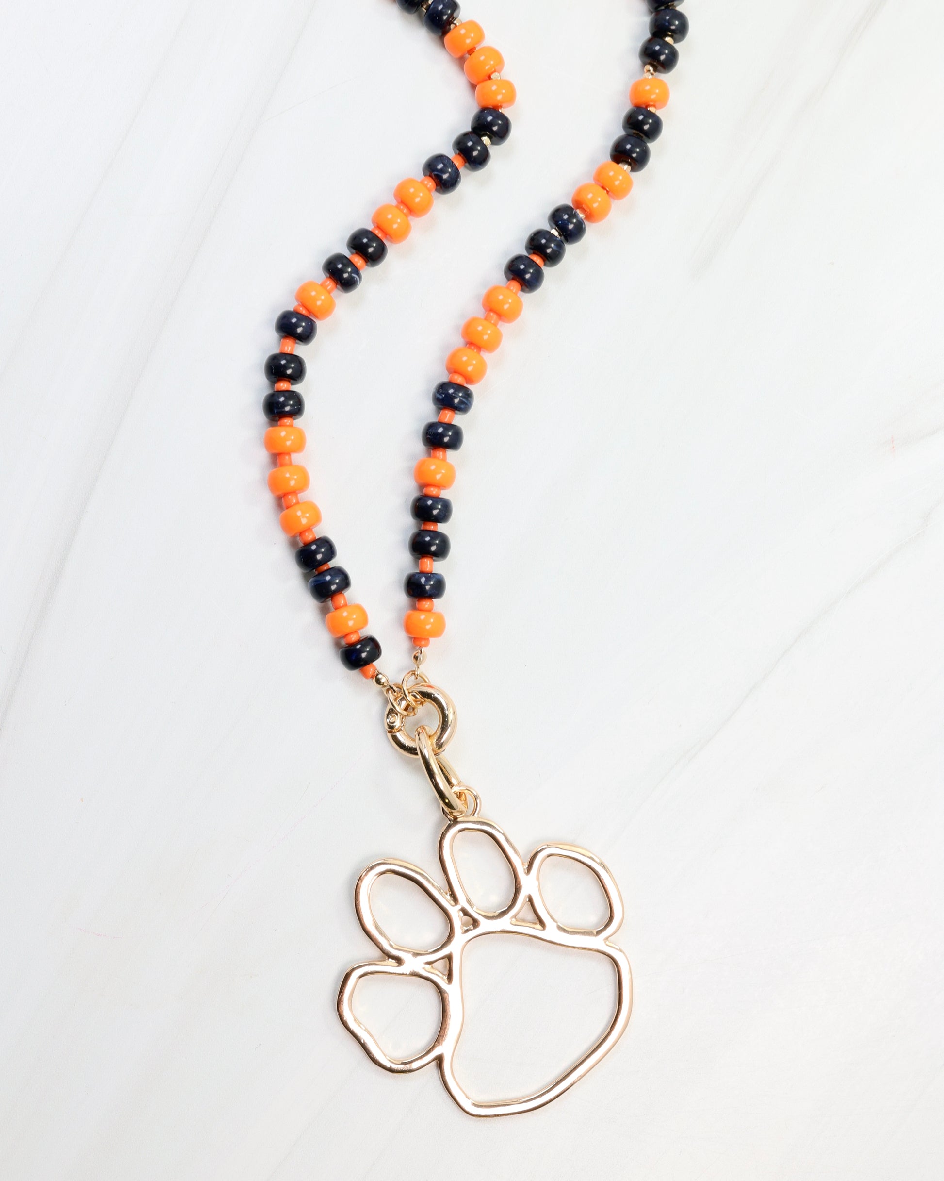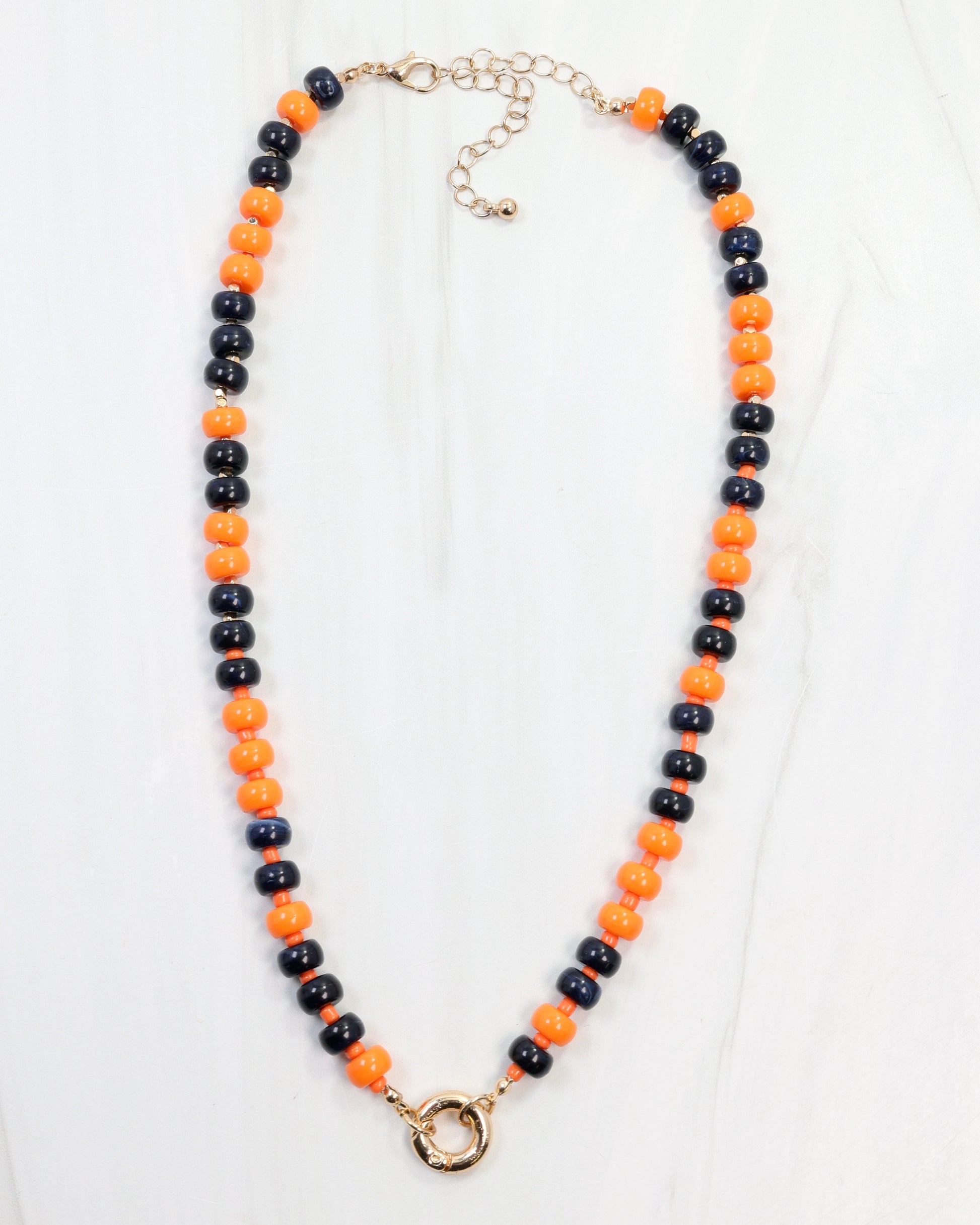 Show your team pride in style with the McLane Stone Necklace featuring bold orange and navy stones. This fashionable piece includes a convenient toggle clasp, allowing you to easily add your favorite charm for a personalized touch. Perfect for game day or everyday wear, it combines spirited design with versatile elegance.